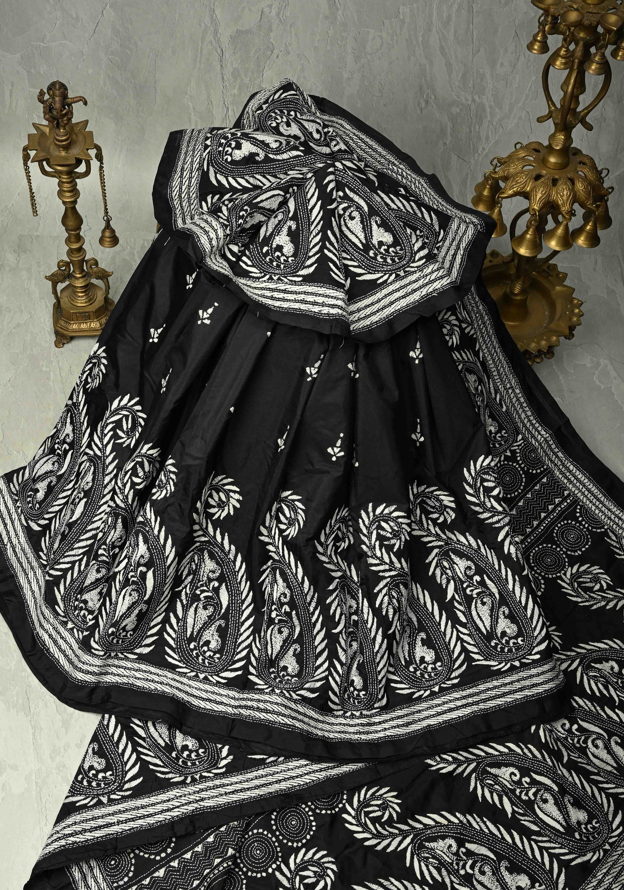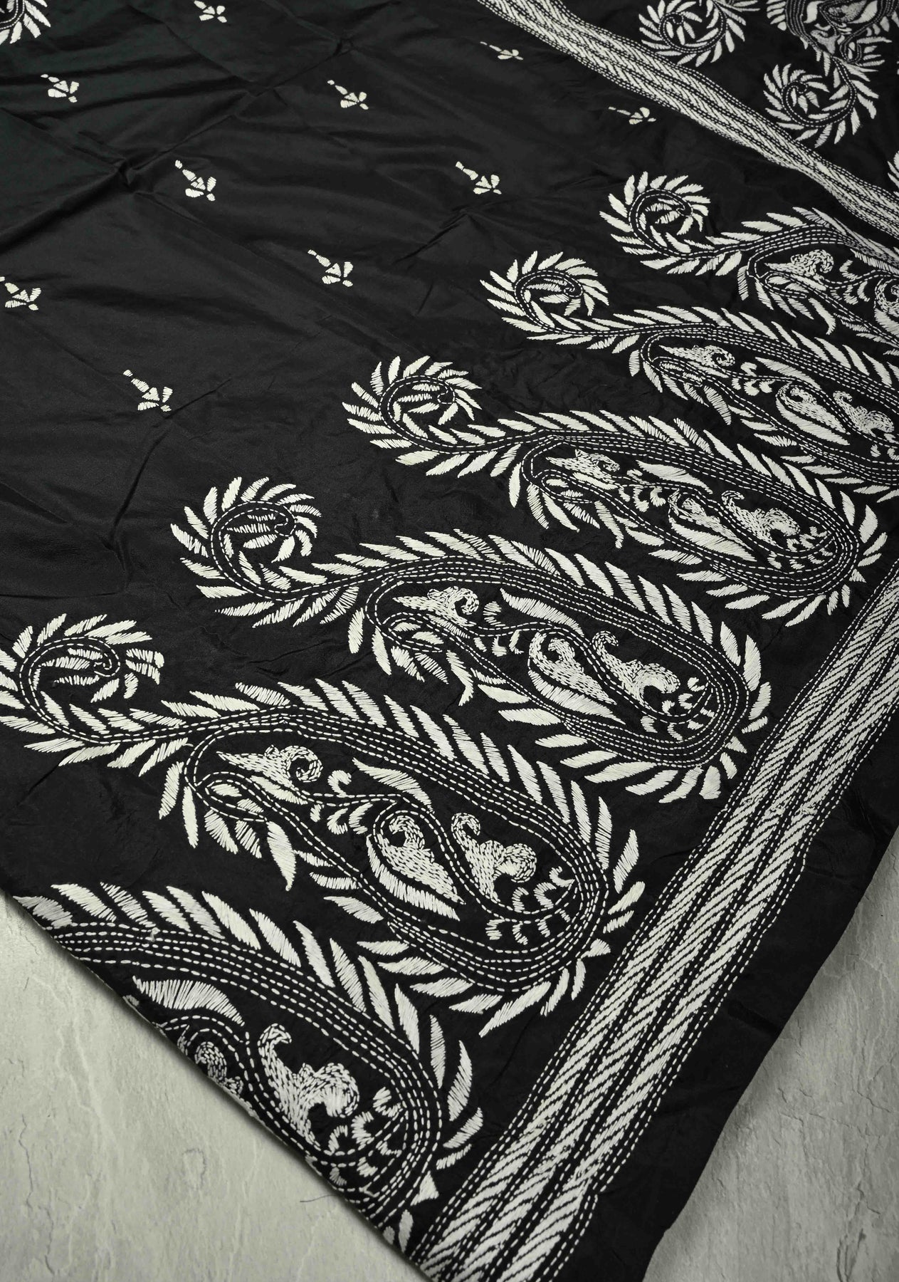This Black Art Silk Saree with Kantha Hand Embroidery is a perfect blend of elegance and traditional craftsmanship. The black base creates a sophisticated canvas, allowing the intricate Kantha hand embroidery to truly shine. The embroidery, done with fine threadwork, features delicate patterns, adding a touch of artistry and texture to the saree.