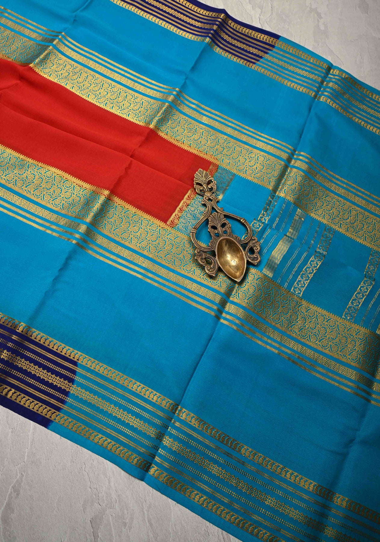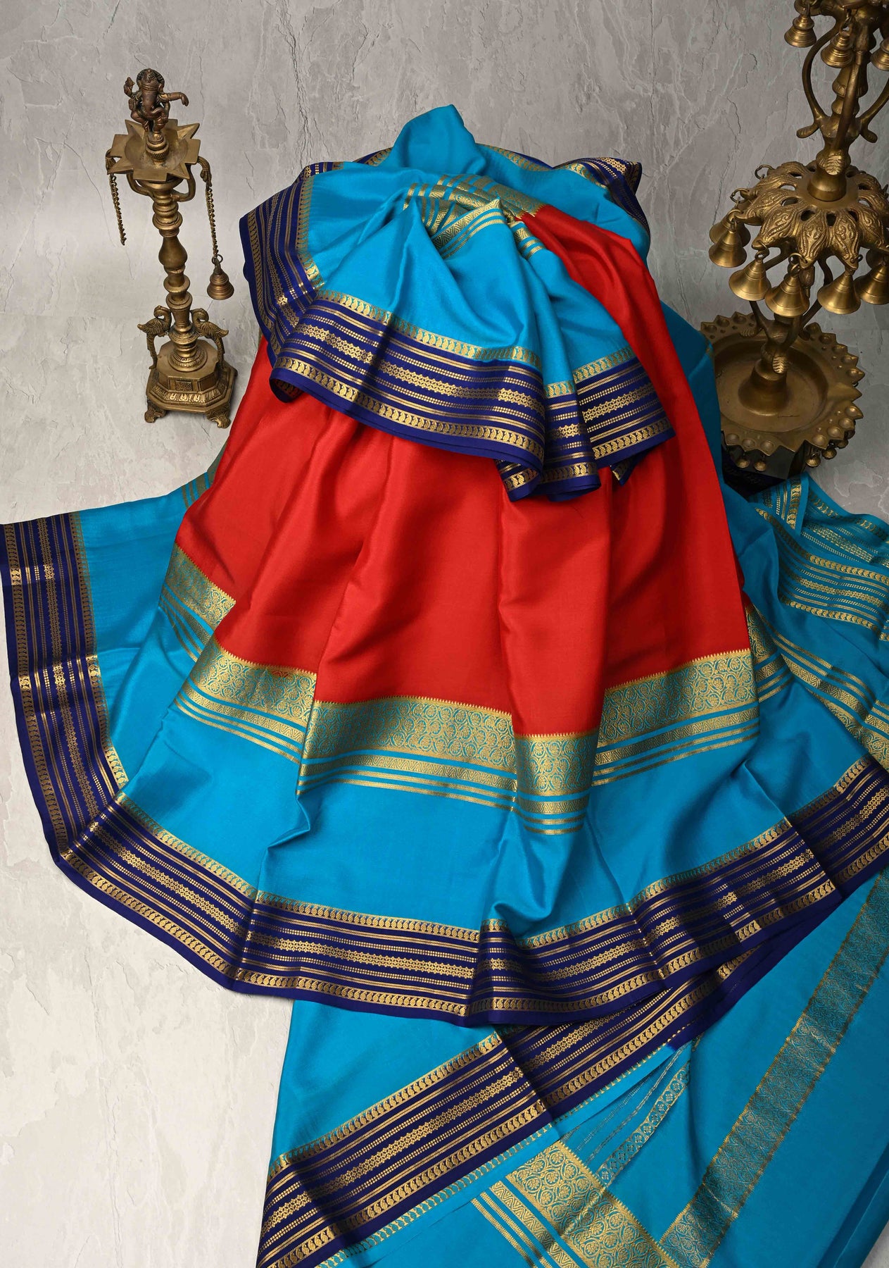 This Red Mysore Silk Saree with a Blue Panel and Zari Border is a vibrant fusion of classic elegance and contemporary contrast. The red body, crafted from pure Mysore silk, radiates festive charm and sophistication. A striking blue panel along the border adds a modern twist, while the finely woven zari detailing lends a touch of traditional opulence. The saree’s smooth texture and fluid drape make it both comfortable and luxurious, perfect for weddings, celebrations, or cultural gatherings. This piece beautifully balances bold color contrast with timeless grace.