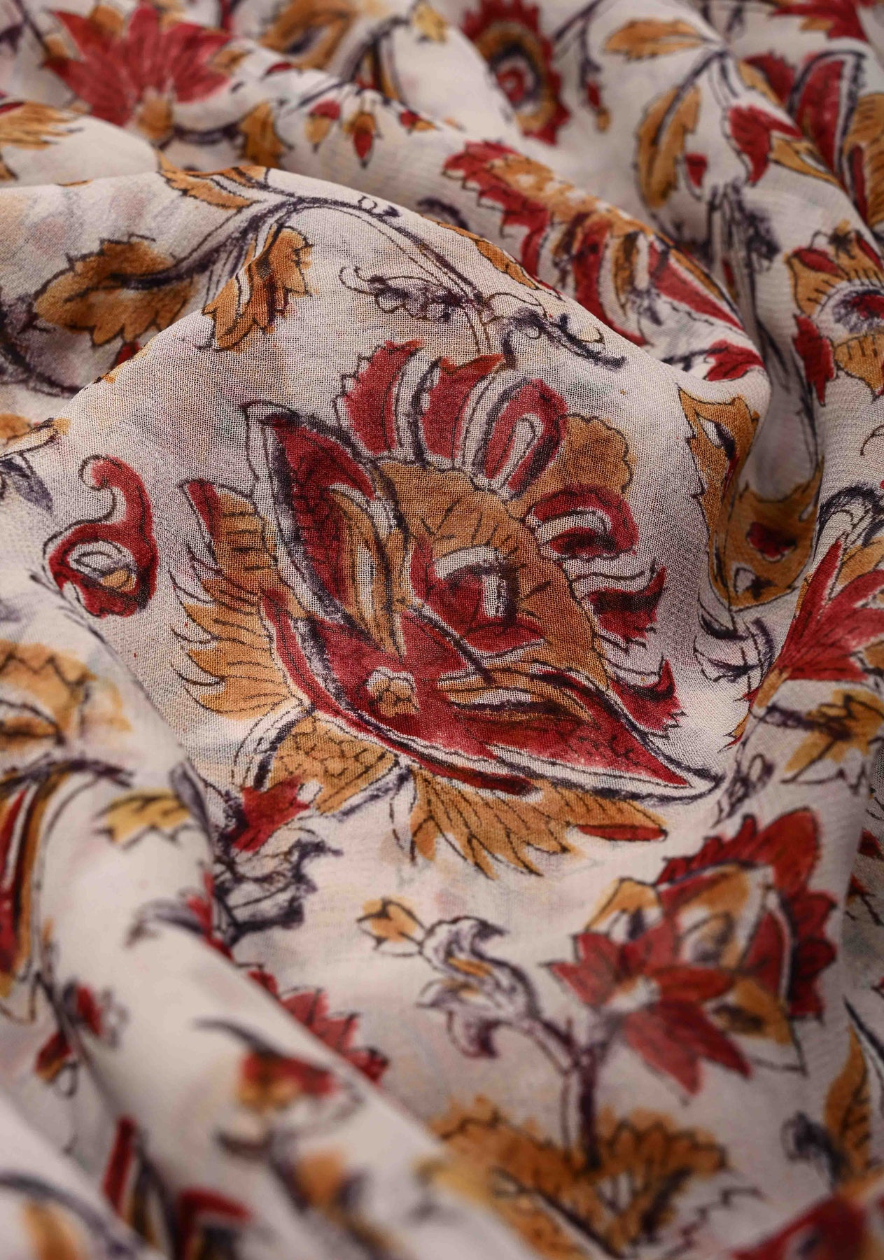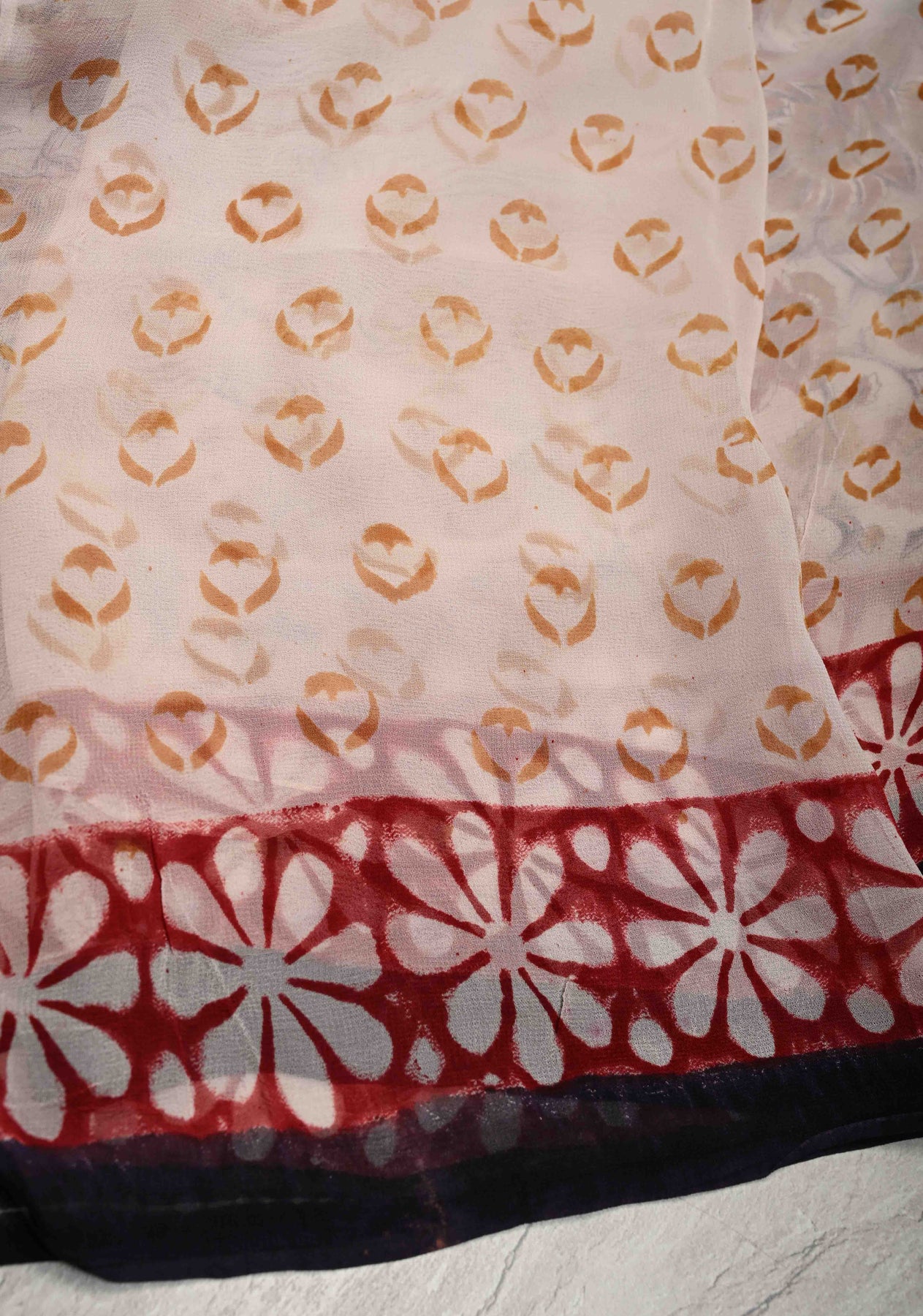 This White Georgette Saree beautifully showcases the elegance of Sanganeri hand block printing, featuring intricate floral and paisley motifs that reflect Rajasthan’s rich artistic heritage. The soft, sheer georgette fabric drapes effortlessly, offering a graceful and lightweight feel. Its pristine white base highlights the detailed hand-printed patterns, making it a versatile choice for daytime functions, festive occasions, or casual gatherings. Combining traditional craftsmanship with modern sophistication, this saree is a timeless addition to your ethnic collection.