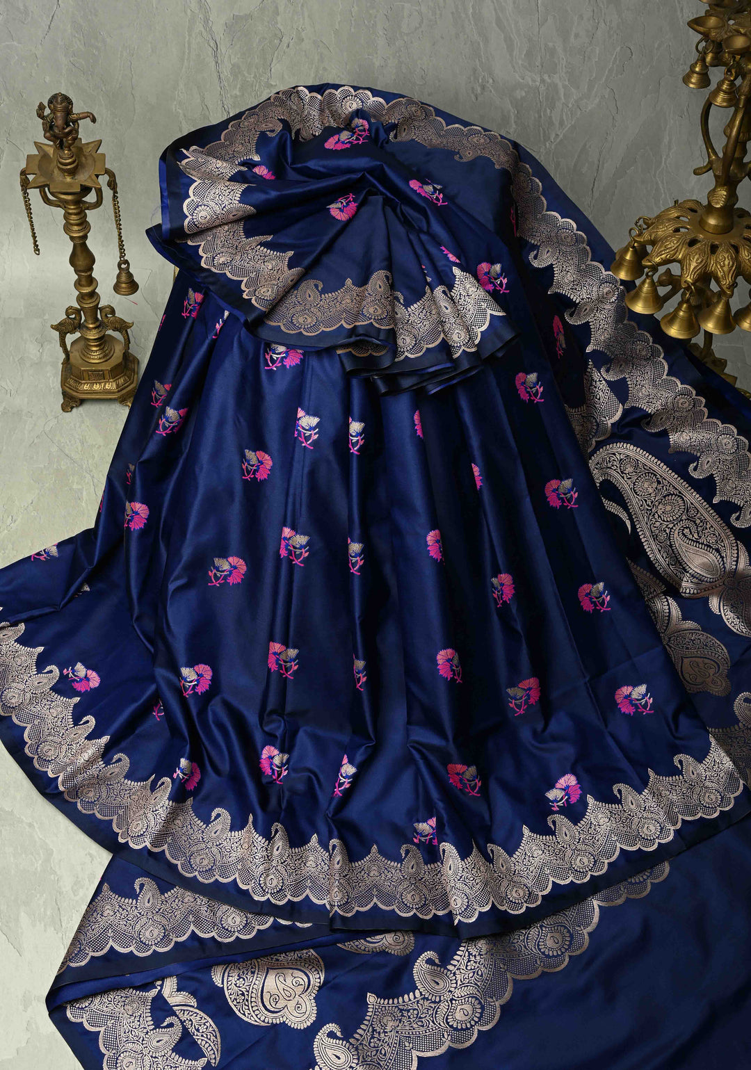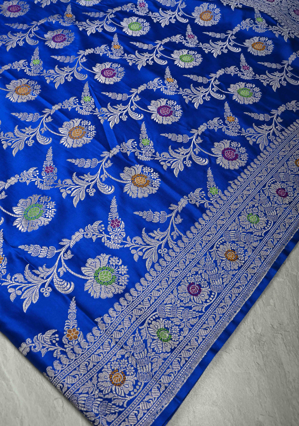 Royal Blue Banarasi Semi Mashru Silk Saree with Meenakari Floral Buttas and Silver Scallop Border