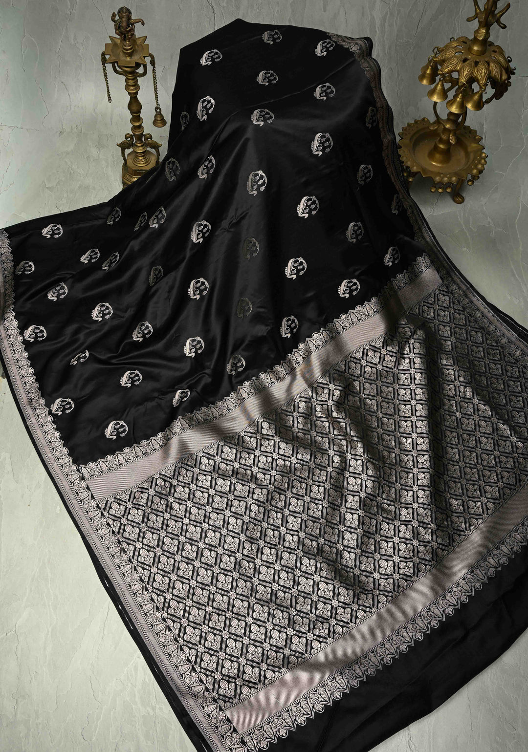 Black Banarasi Semi Mashru Silk Saree with Zari Buttas and Zari Border