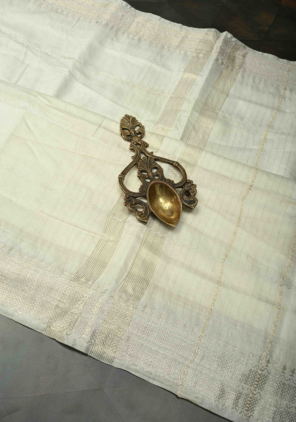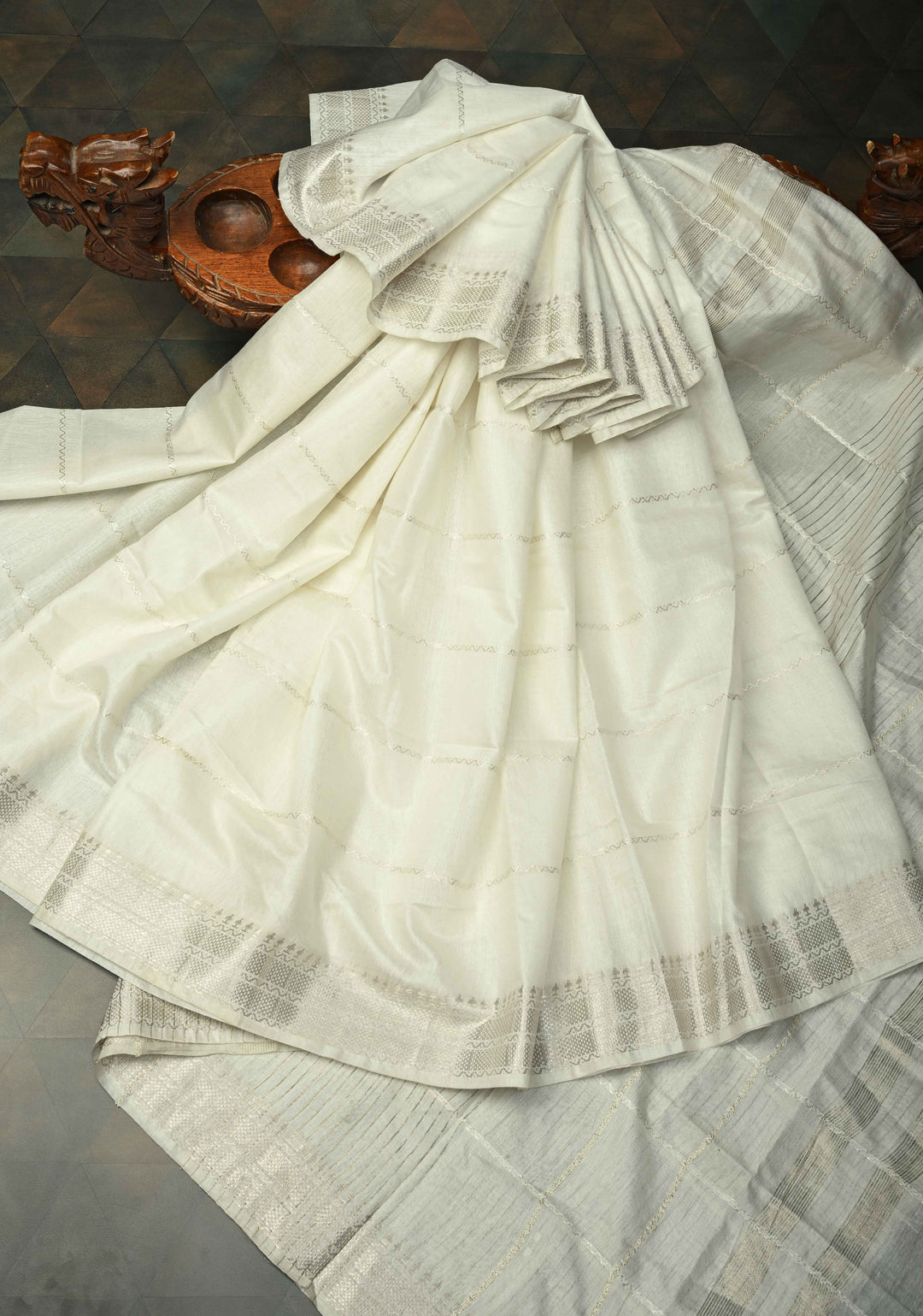 Powdered Sugar White Semi Tussar Saree with Thread Stripes and Zari Border