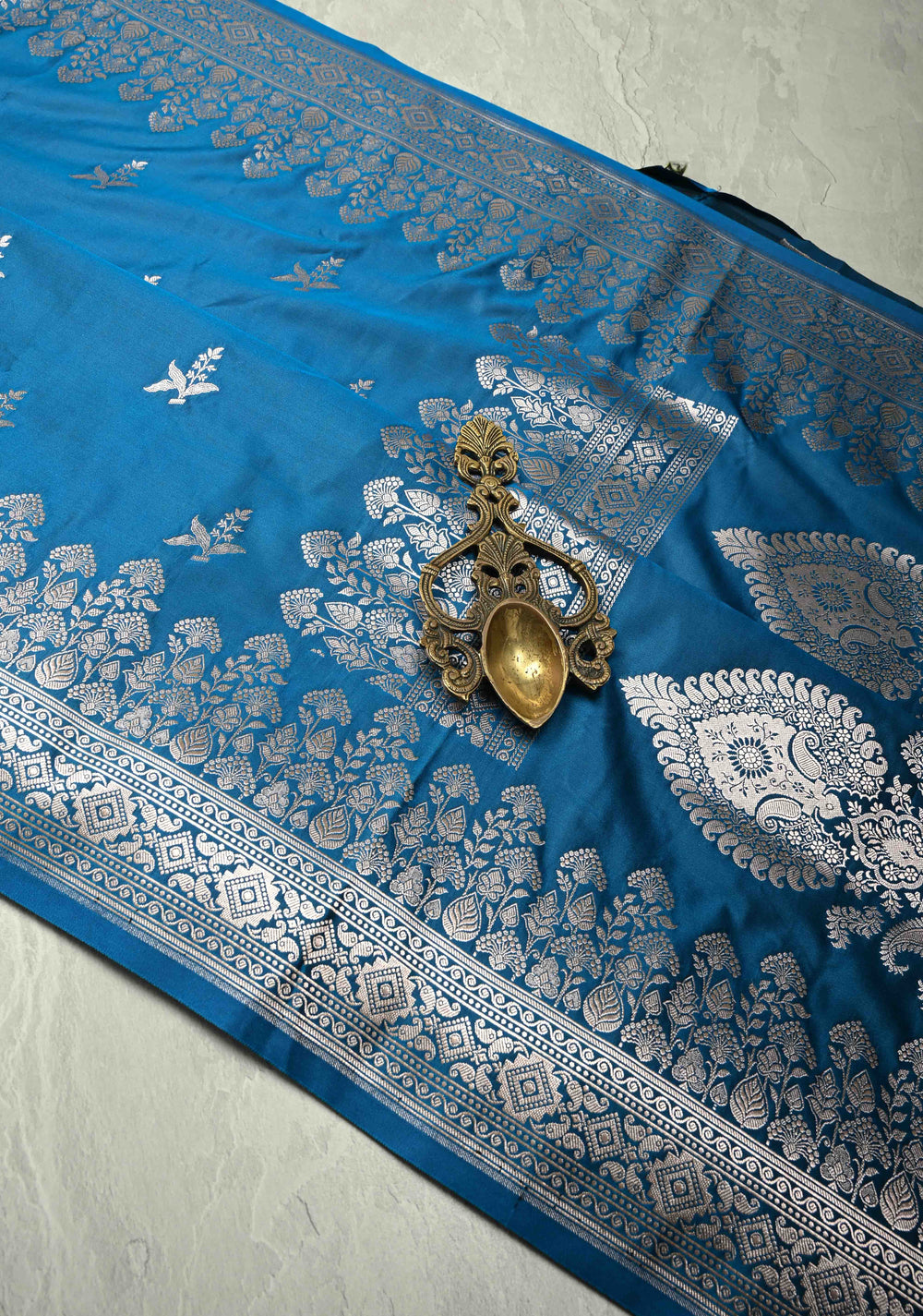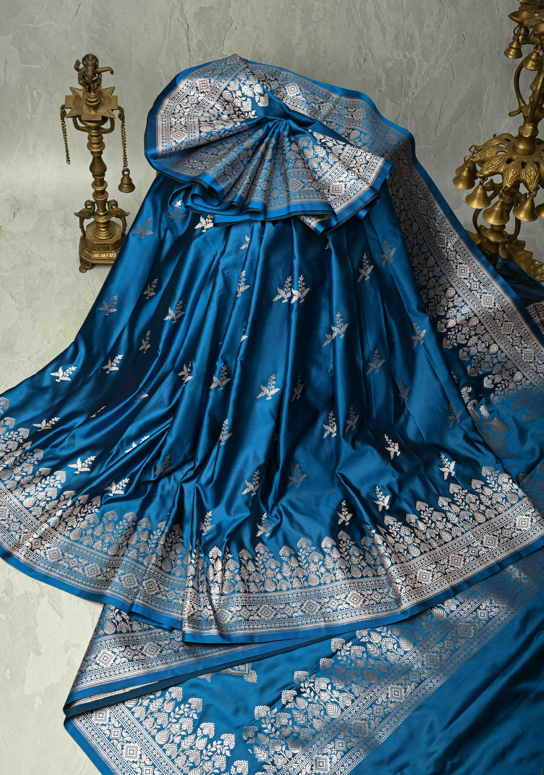 Peacock Blue Banarasi Semi Mashru Silk Saree with Silver Zari Buttas and Floral Zari Border