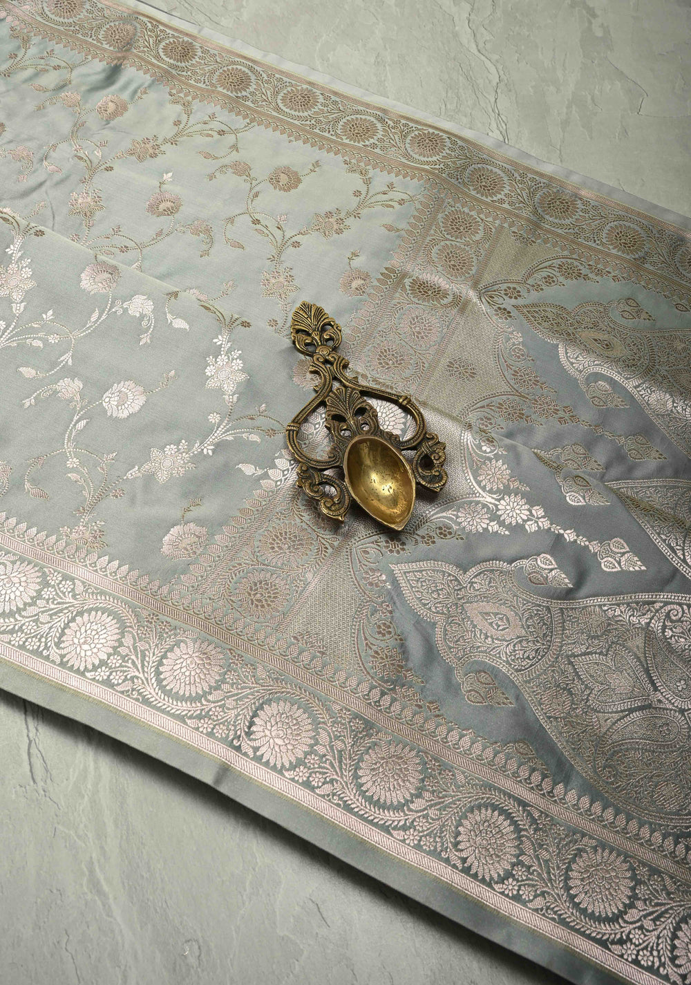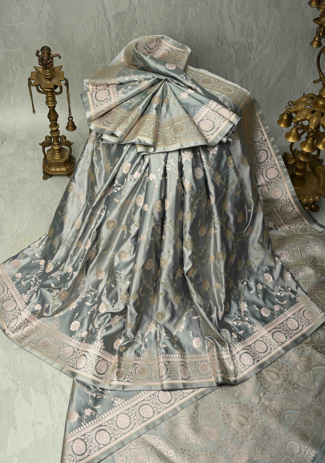 Gray Banarasi Semi Mashru Silk Saree with Silver Floral Jaal and Zari Border