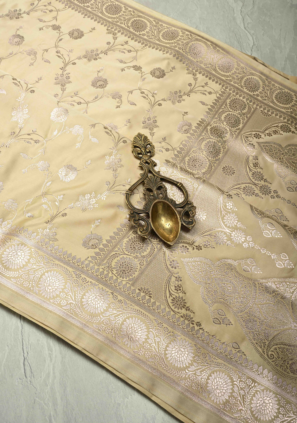 Champagne Banarasi Semi Mashru Silk Saree with Floral Jaal and Zari Border