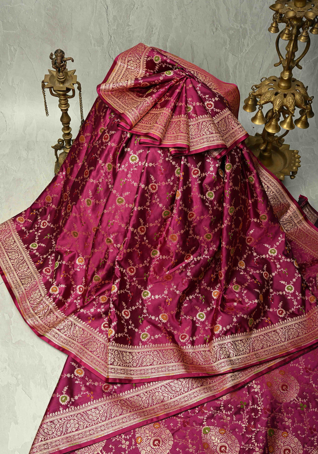Plum Banarasi Semi Mashru Silk Saree with Meenakari jaal Design and Bright Gold Zari detailing