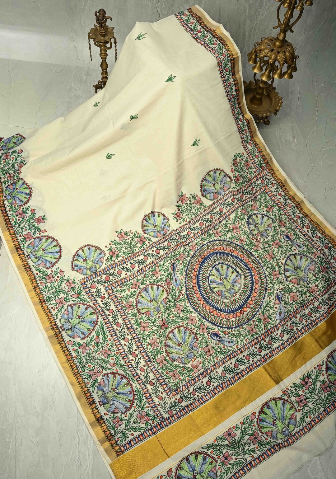 Off White Keral Cotton Saree with Madhubani Hand painted and Minimal Zari Border