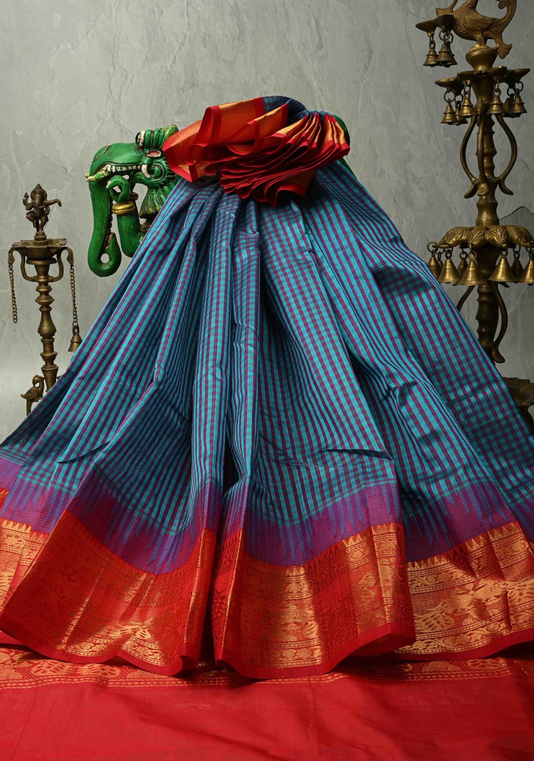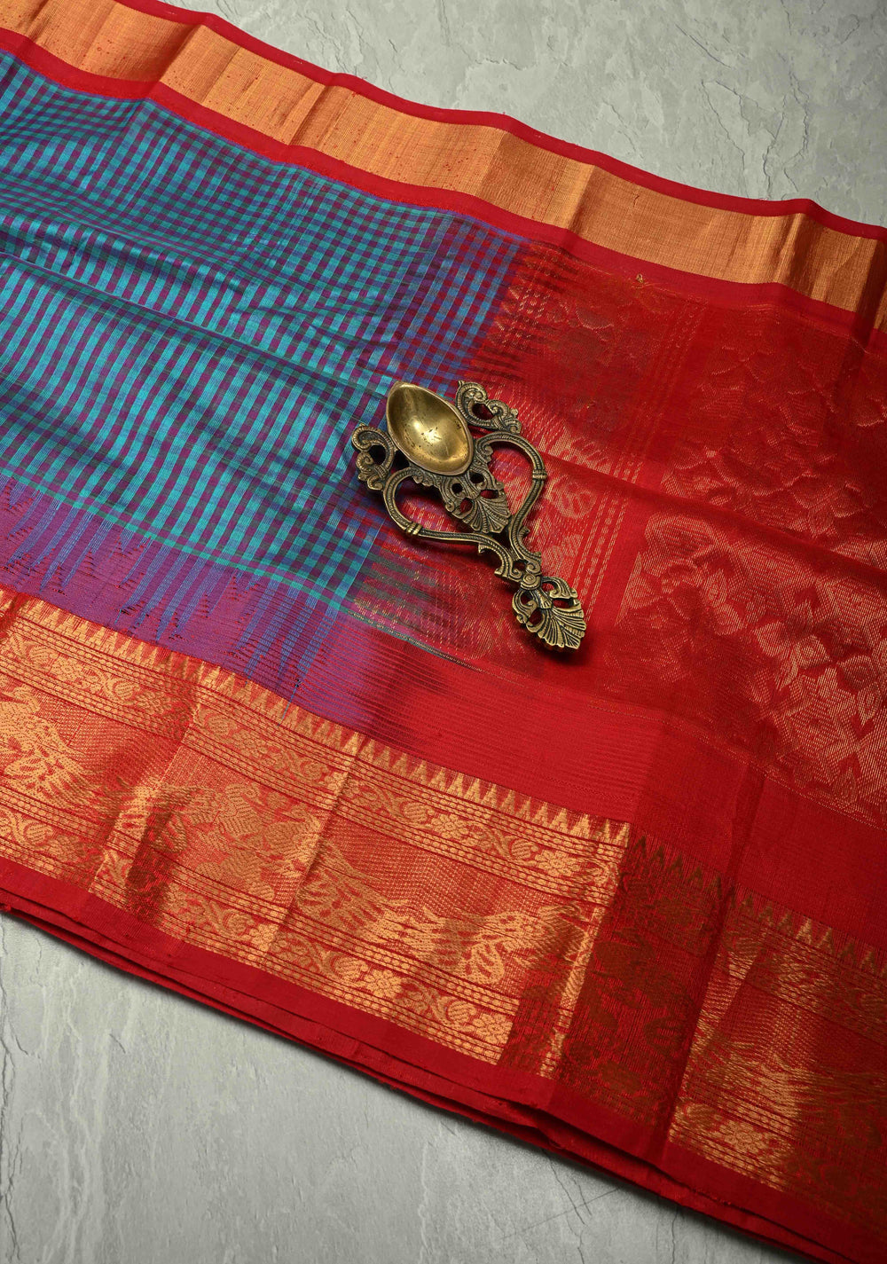 Blue-Purple Charming Vintage Checks on Kanchi Silk Cotton Saree with Contrast Zari border