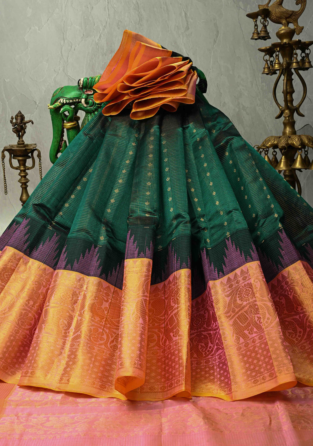 Emerald Green Vairaoosi Zari Stripes Kanchi Silk Cotton Handloom Saree with Zari Buttas and Contrast Temple Wide Zari Border