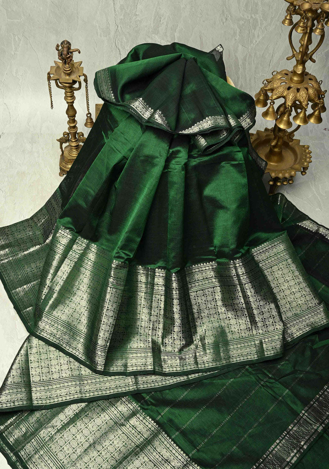 Dark Green Handwoven Mangalagiri Silk Cotton Saree with Wide Silver Zari Border