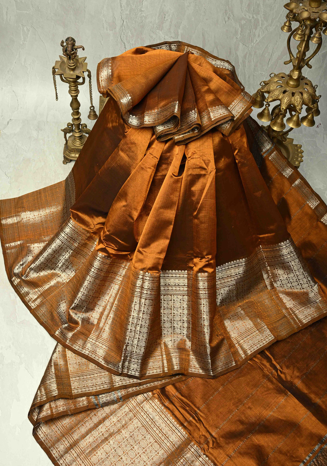 Copper Brown Dual Tone Handwoven Mangalagiri Silk Cotton Saree with Wide Silver Zari Border
