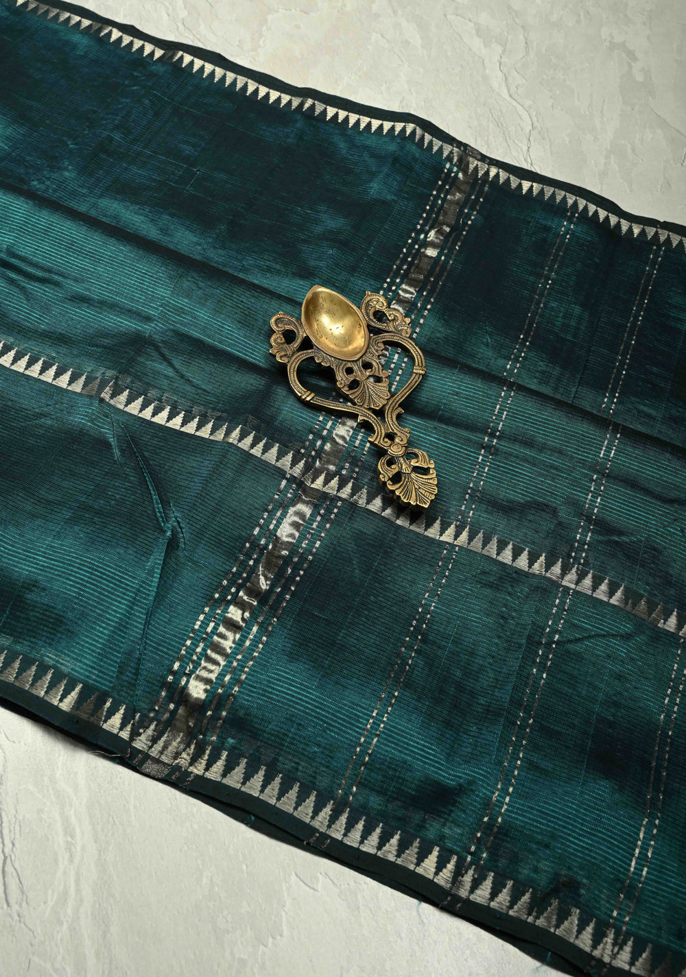 Bottle Green Handwoven Mangalagiri Silk Cotton Saree with Temple Wide Zari Border