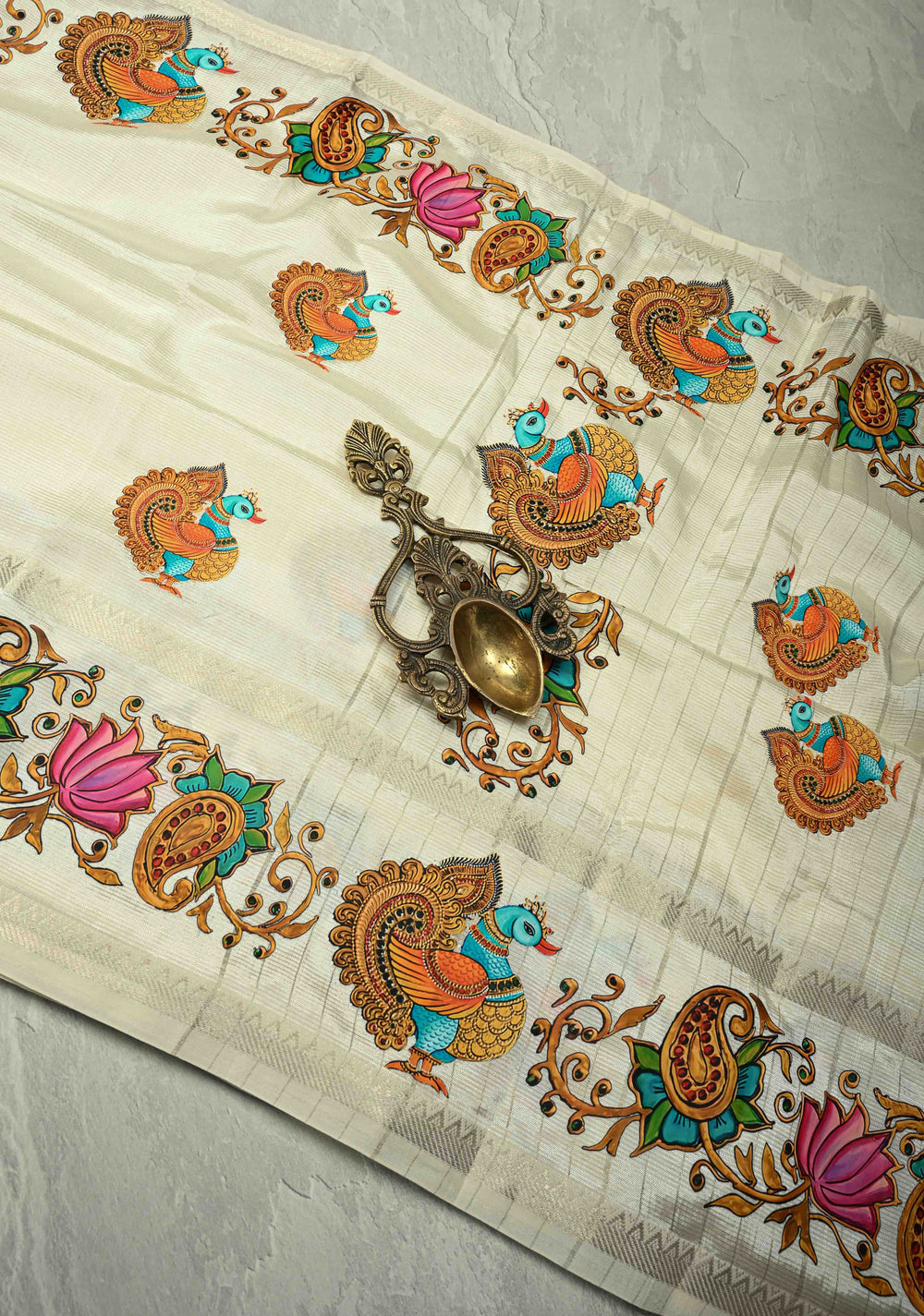 Off White Handwoven Mangalagiri Silk Cotton Saree with Printed Peacock Motifs