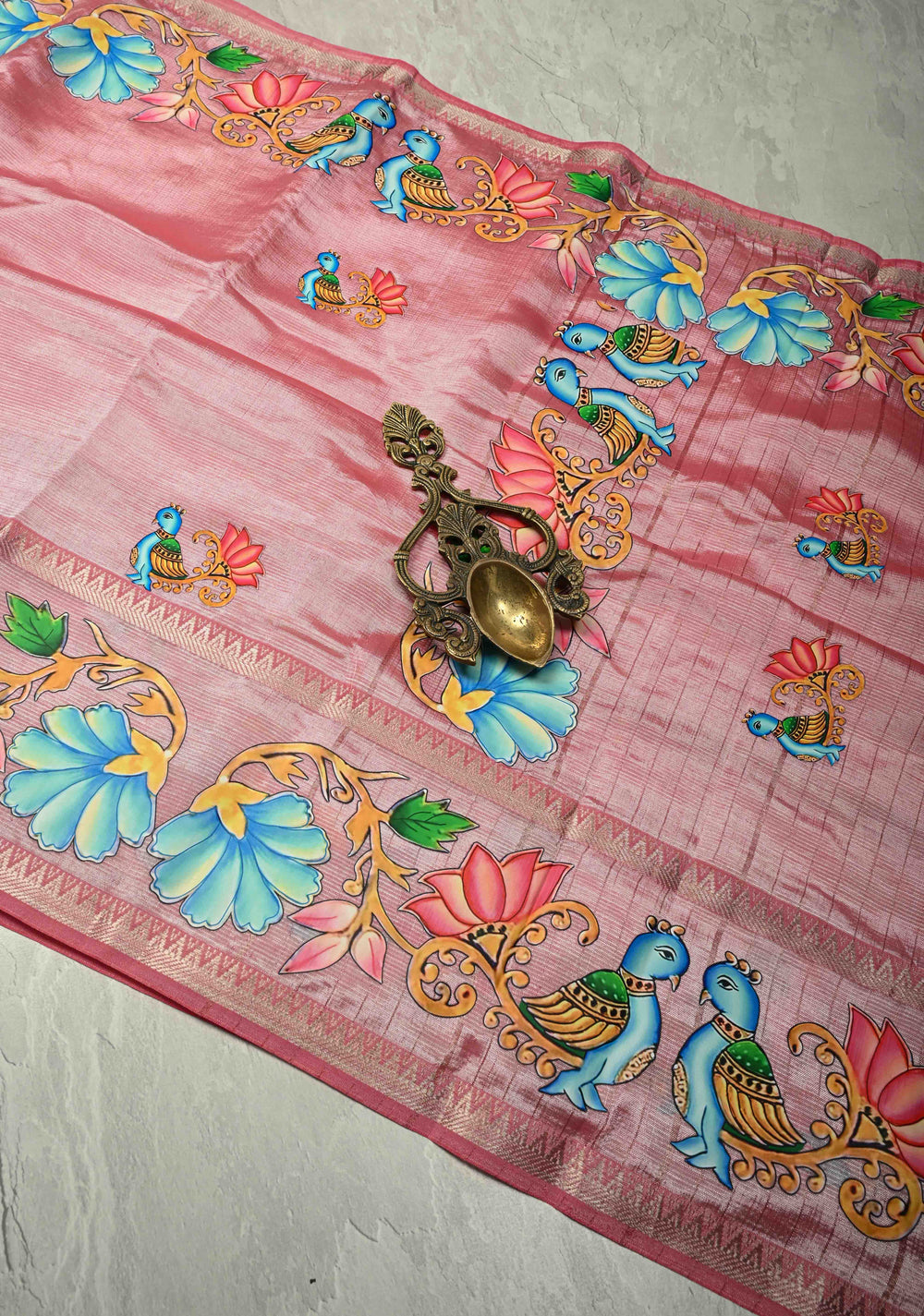Rose Pink Handwoven Mangalagiri Silk Cotton Saree with Printed Parrot Motifs