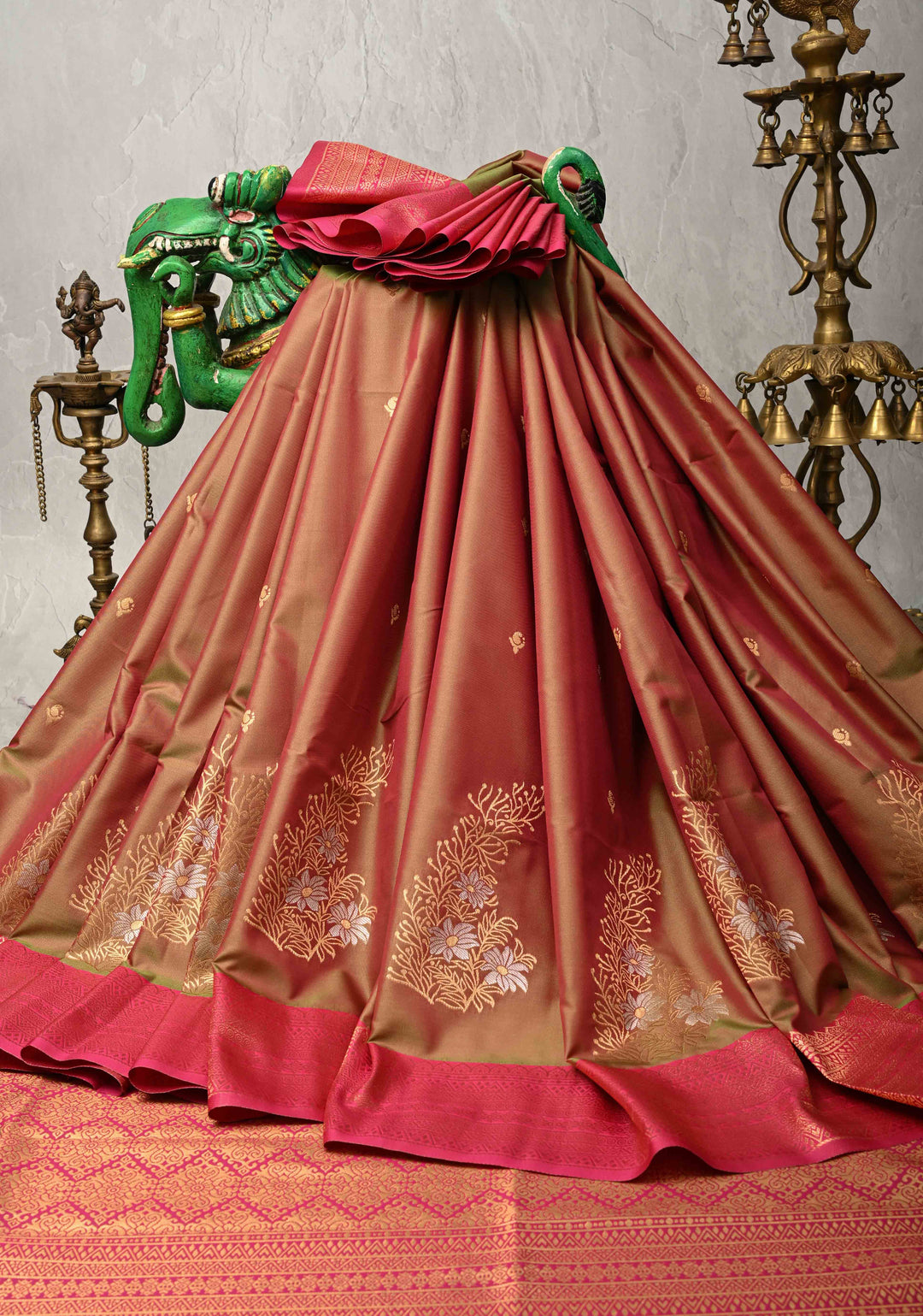 Pink Green Dual Tone Kanchi Semi Silk Saree with Floral Alfi Buttas and Contrst Zari Border