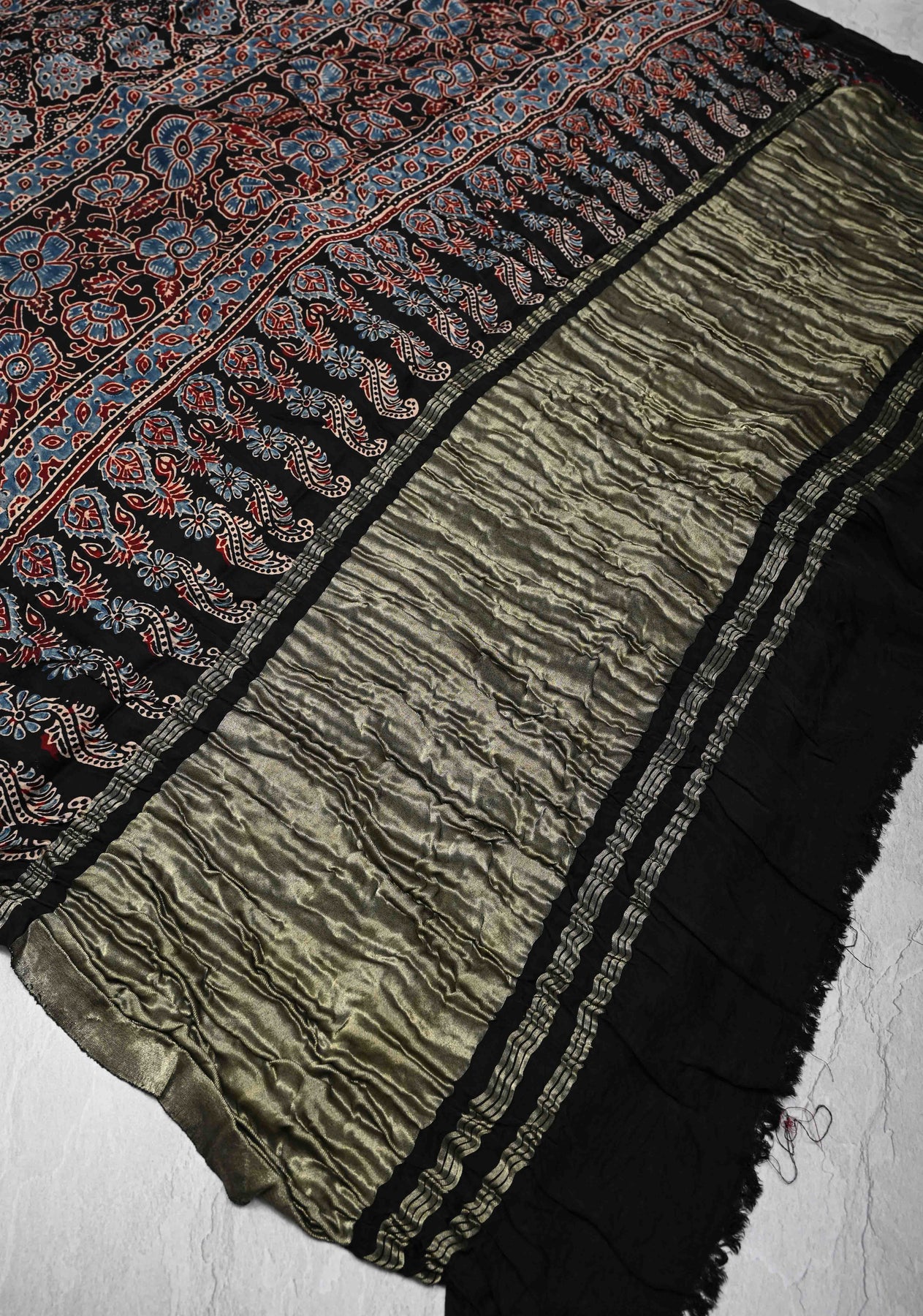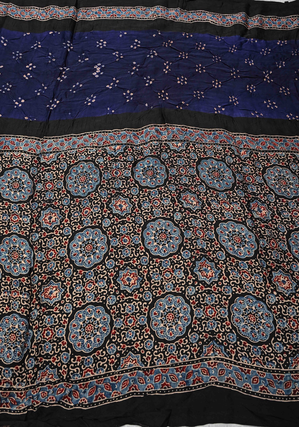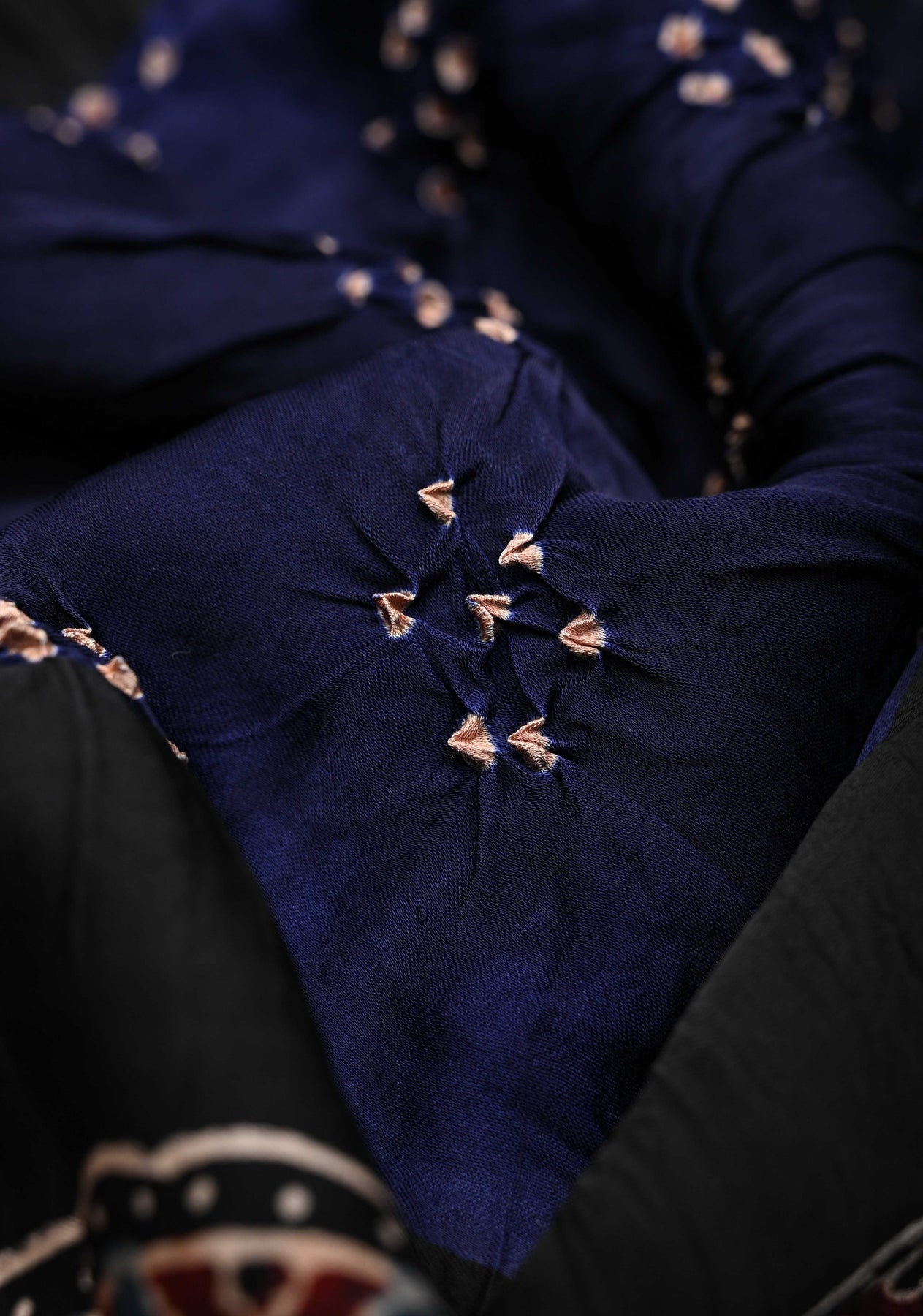 This Navy Blue Modal Silk Saree is a striking expression of heritage craft and contemporary elegance. Crafted from soft and fluid modal silk, the saree showcases a unique fusion of Bandhani and Ajrakh techniques — two iconic traditional art forms from Gujarat and Rajasthan. The intricate patterns and vibrant detailing lend a rich cultural narrative to the fabric. The highlight of the saree is its crushed pallu, which adds a modern textural twist and enhances the overall drape. In a deep navy blue shade, this saree is perfect for festive occasions, cultural events, or statement-making everyday wear.