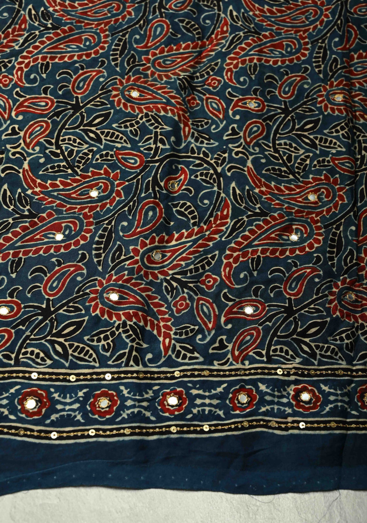 Make a bold statement with this Bright Red Ajrakh Block Print Saree, crafted on ultra-soft and breathable modal fabric. Featuring traditional Ajrakh hand block printing, this saree is elevated with intricate mirror work and fine Ari embroidery, adding a touch of sparkle and artisanal elegance. The red base brings energy and richness, while the lightweight modal ensures effortless draping and all-day comfort. Ideal for festive occasions, intimate gatherings, or artistic everyday wear, this saree beautifully merges cultural heritage with modern grace.