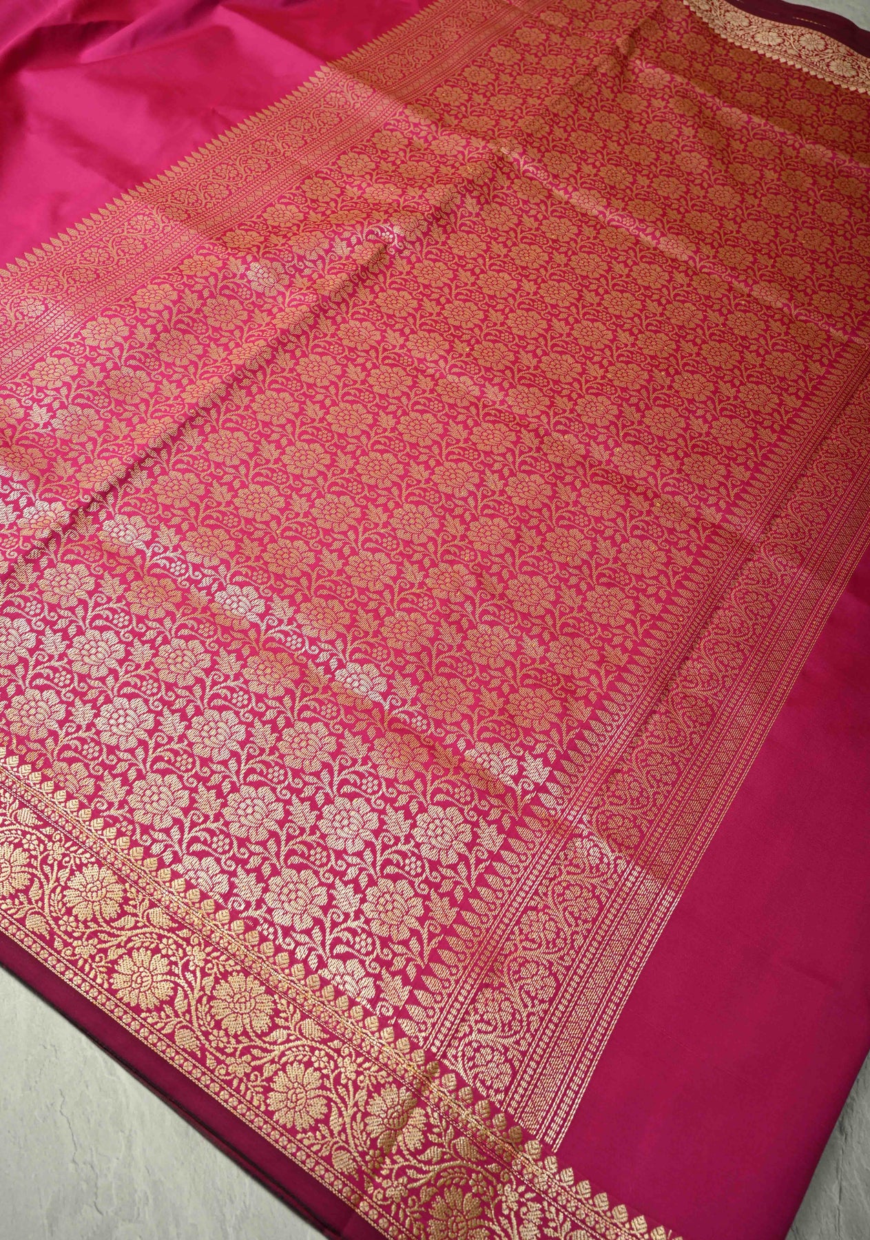 The Deep Pink Semi-Silk Saree with Floral Zari Border is a stunning blend of vibrant charm and traditional elegance. Crafted from semi-silk fabric, it offers a smooth, lustrous drape that enhances every silhouette. The deep pink shade exudes femininity and grace, while the intricately designed floral zari border adds a delicate, regal accent. Ideal for weddings, festive occasions, and special celebrations, this saree pairs beautifully with a contrasting or matching blouse and statement jewelry for a timeless ethnic look.