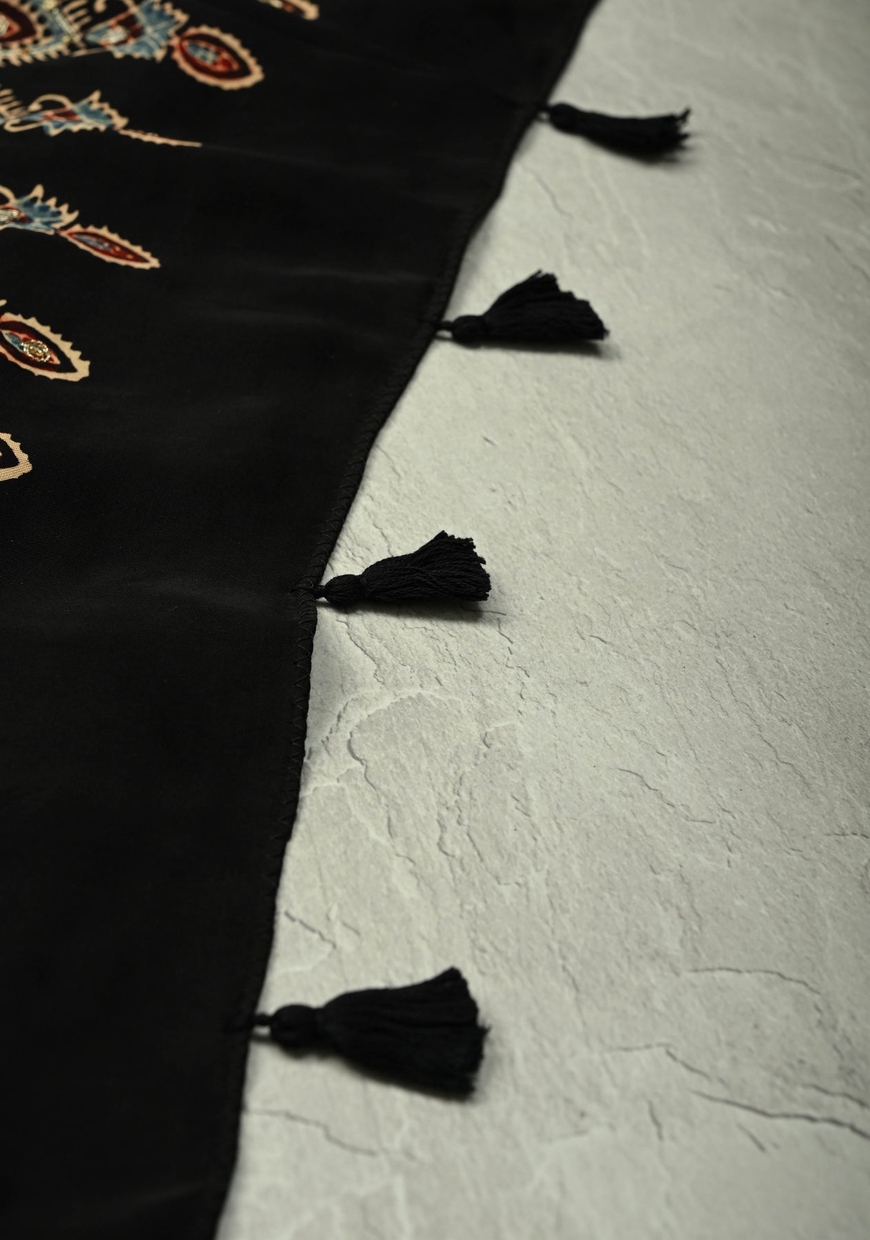 This saree is ready to wear with fall and pico done. An unstitched blouse fabric is included. tassels adorn pallu.