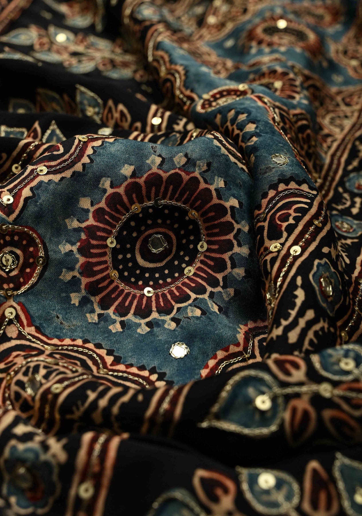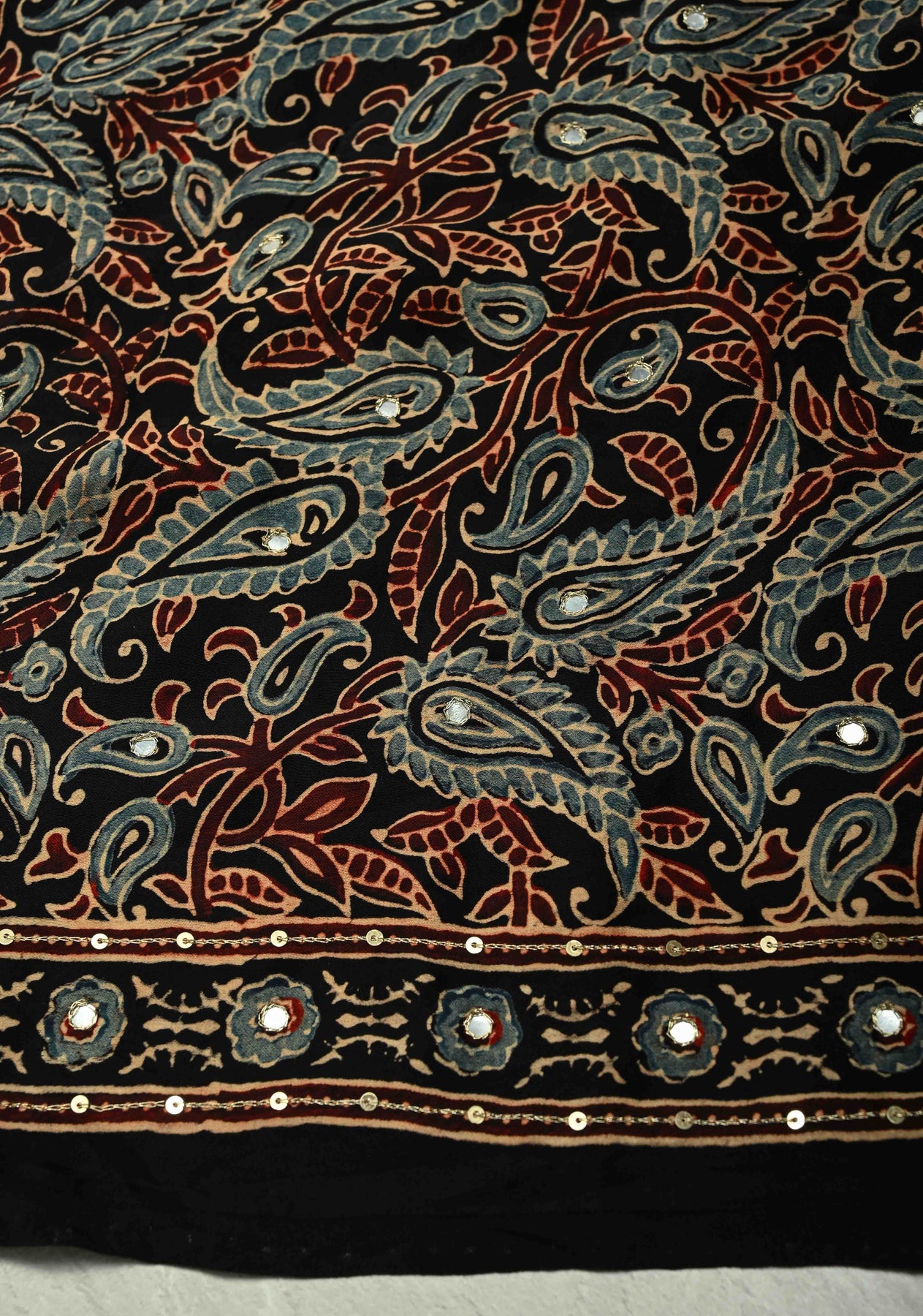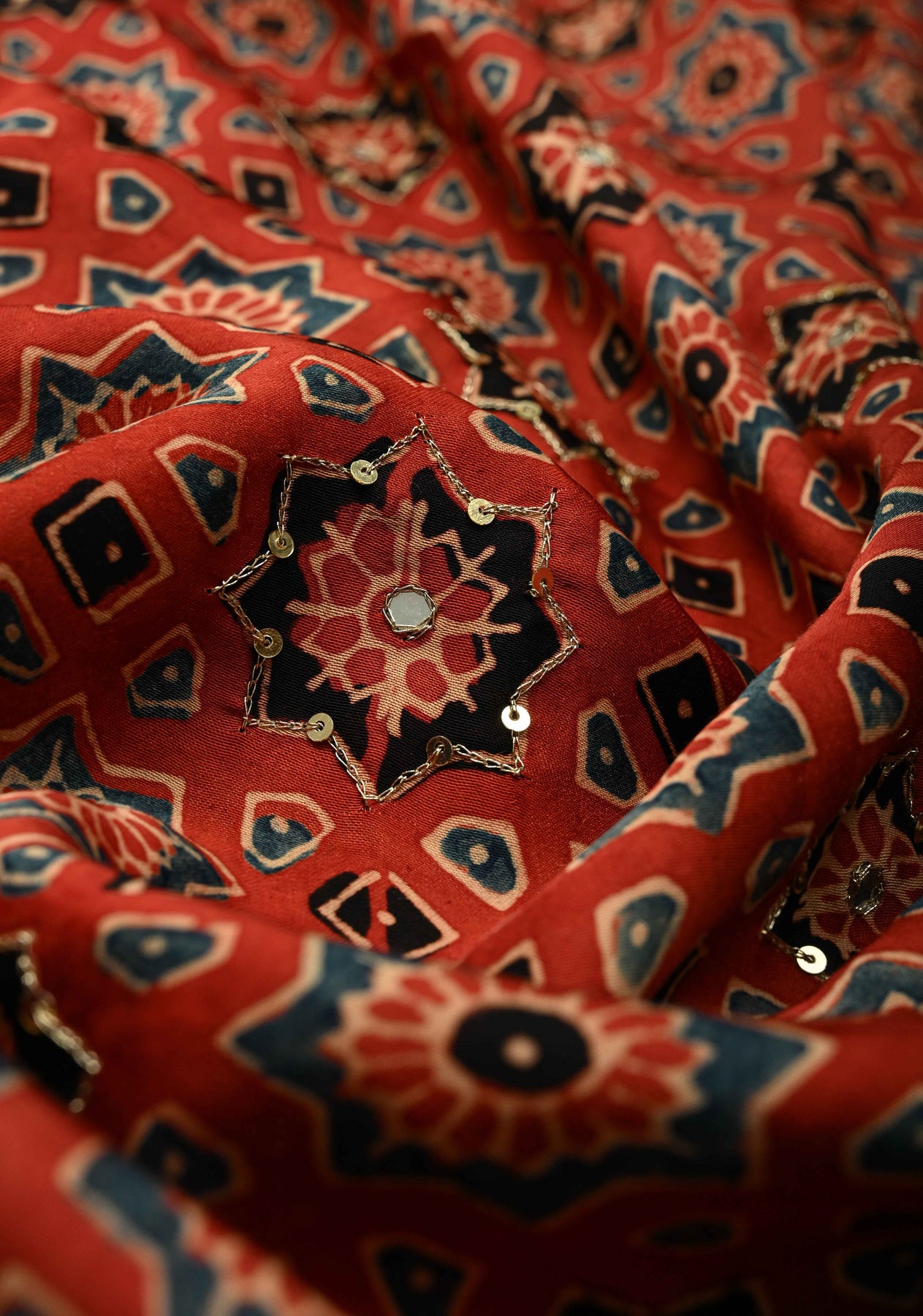 Unveil the beauty of handcrafted tradition with this Exquisite Red Ajrakh Block Print Saree on luxuriously soft modal fabric. Showcasing intricate Ajrakh block printing in rich, natural tones, the saree is elevated with delicate mirror work and fine Ari embroidery, adding depth, sparkle, and artisanal finesse. The breathable modal drapes gracefully, offering all-day comfort without compromising on elegance. Perfect for festive occasions, cultural gatherings, or making a statement at casual events, this saree is a blend of heritage craft and modern sophistication.