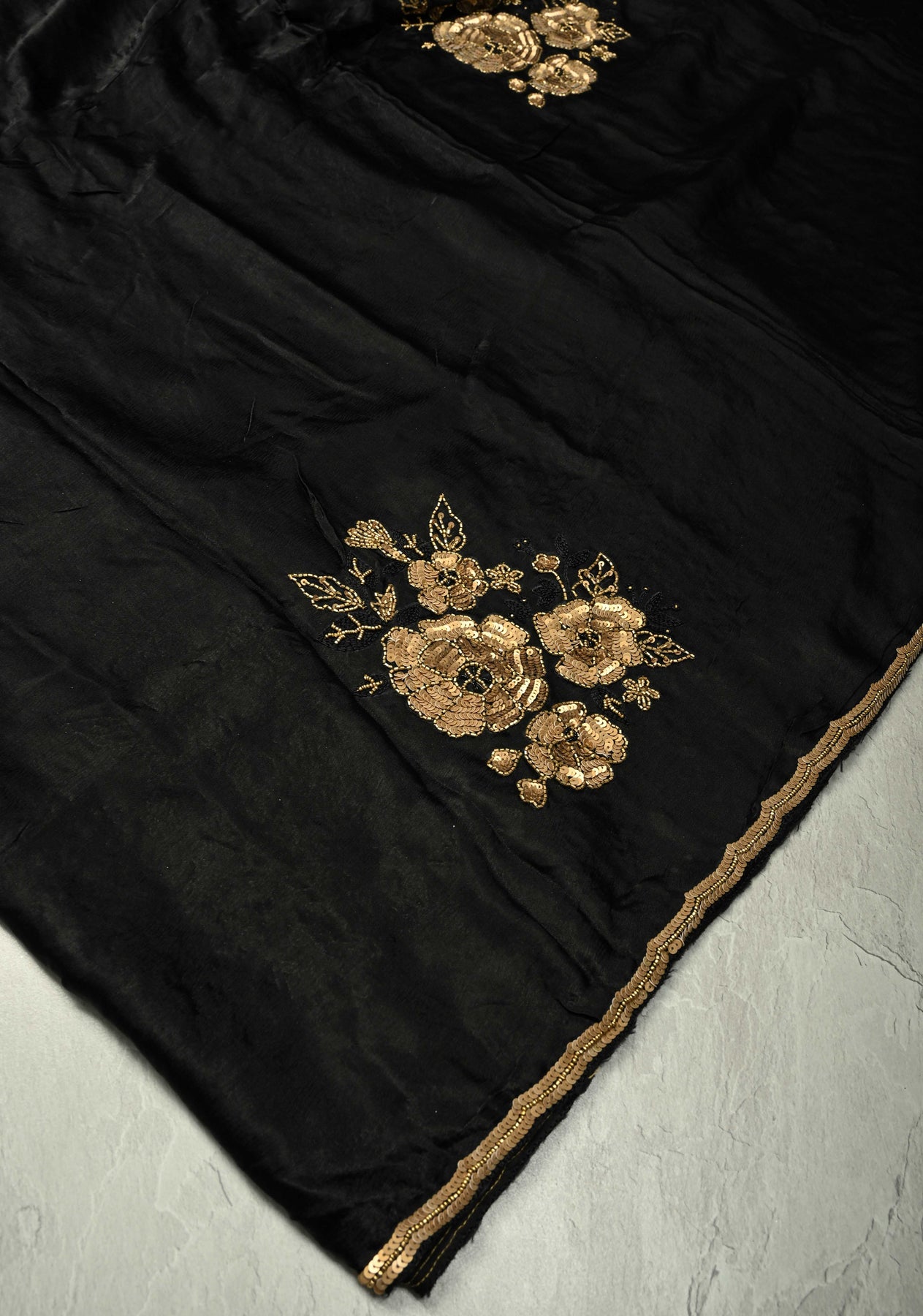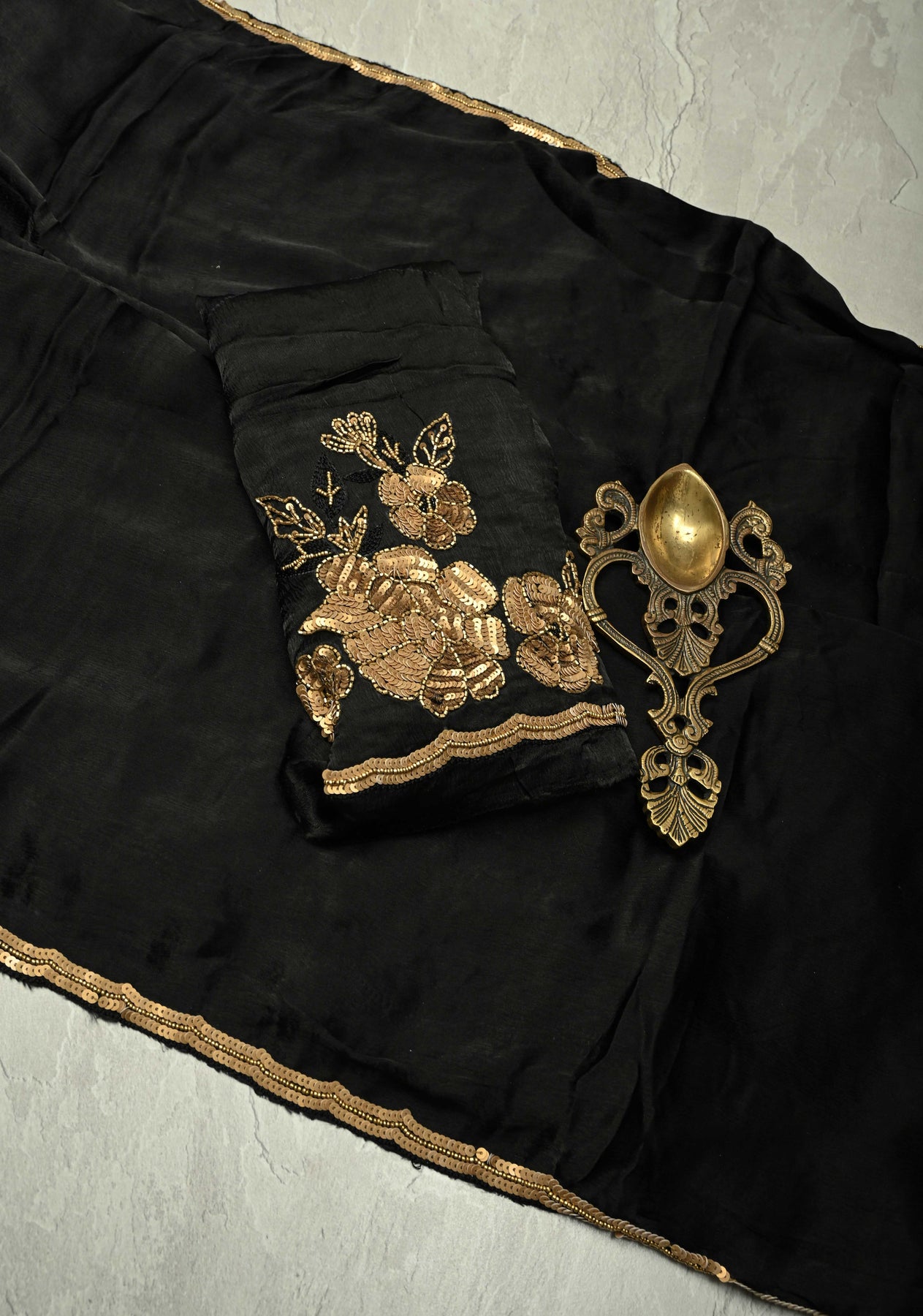 Stunning Black Satin Georgette Saree with Antique Matte Finish Cutdana, Sequins and Moti Embellishment and Scallop Border