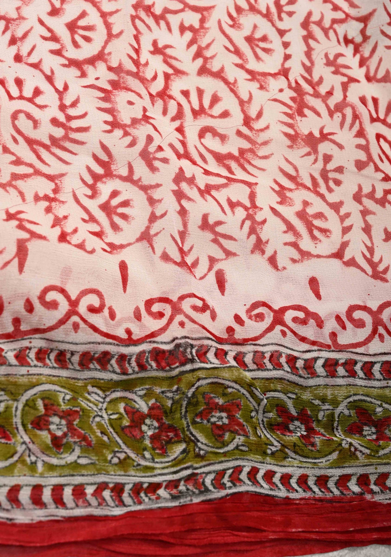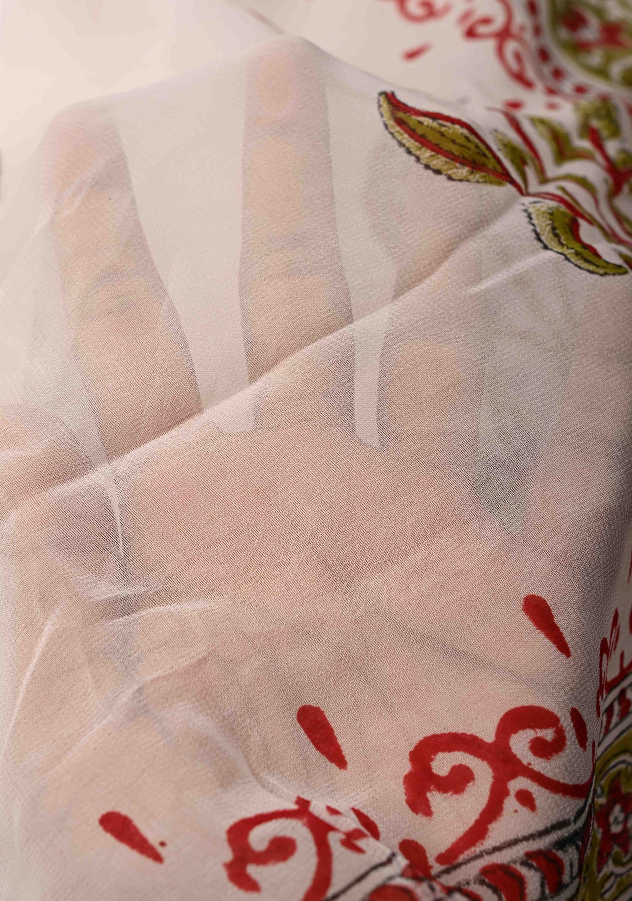 This elegant White Georgette Saree features the timeless beauty of Sanganeri hand block print, a traditional craft known for its intricate floral and paisley motifs. Crafted on soft, flowing georgette fabric, the saree drapes gracefully, offering both comfort and sophistication. The delicate hand block prints in vibrant yet subtle hues add a charming ethnic touch, making it ideal for both casual and festive occasions. Its lightweight texture and breathable quality ensure ease of wear throughout the day. Perfectly blending tradition with contemporary style, this saree is a versatile addition to any wardrobe