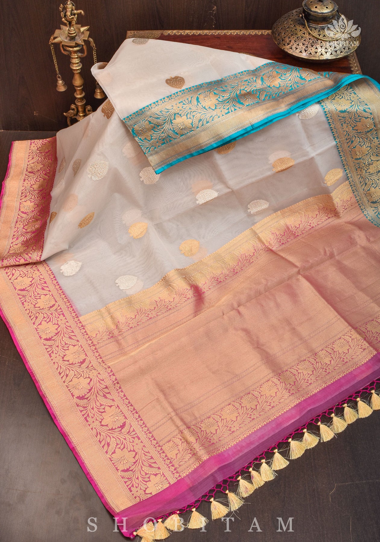 Pure Organza  Banarasi Ivory with Ganga Jamuna borders and Sona Rupa Zari | SILK MARK CERTIFIED