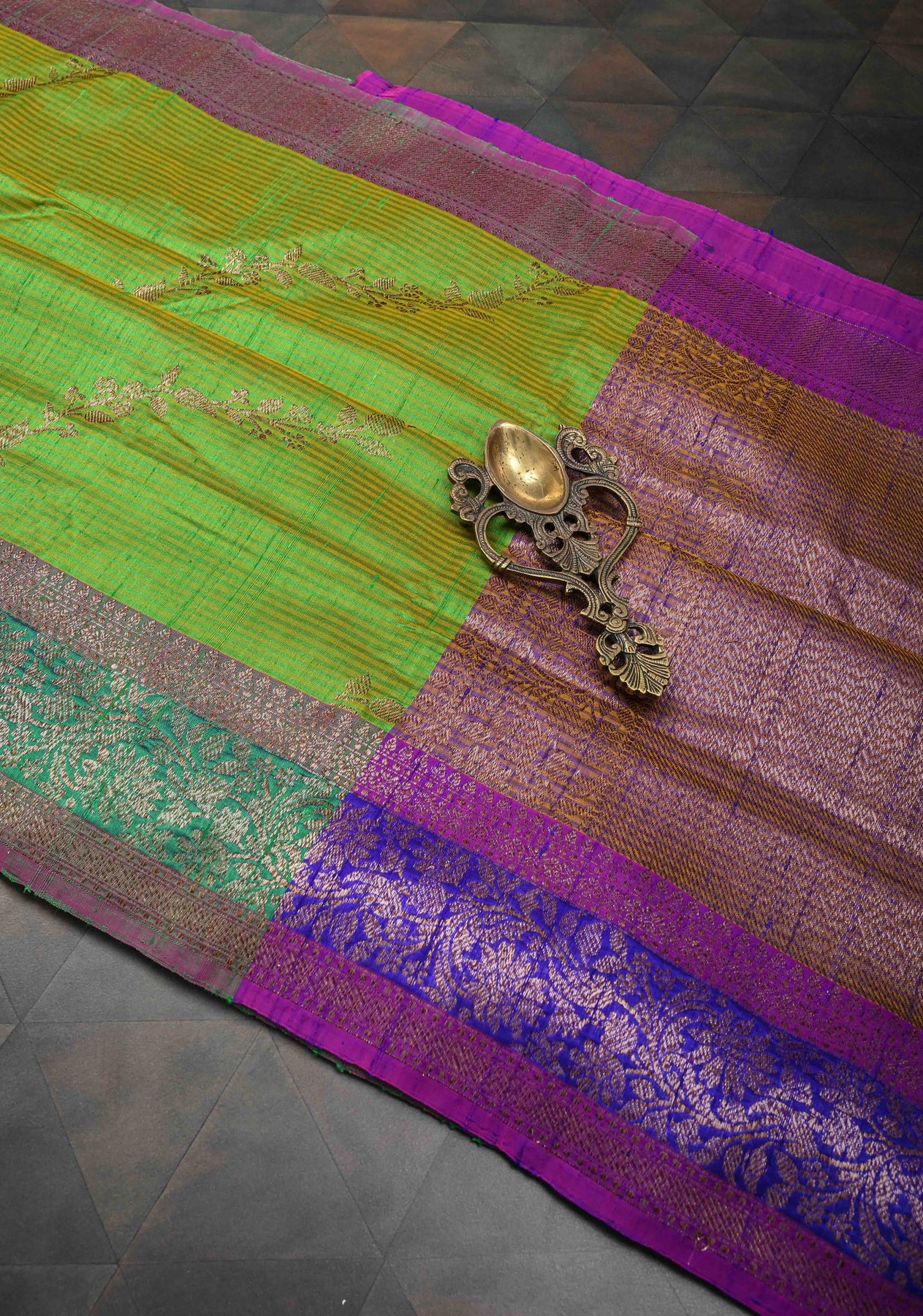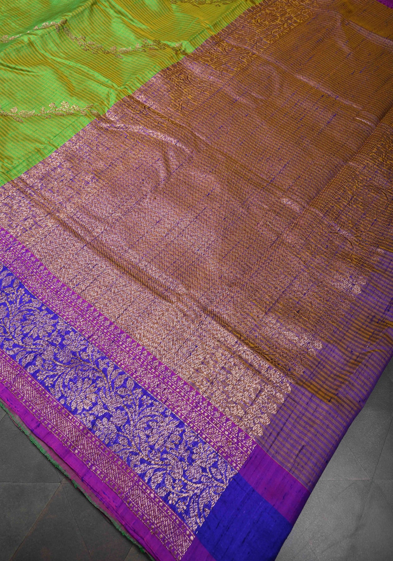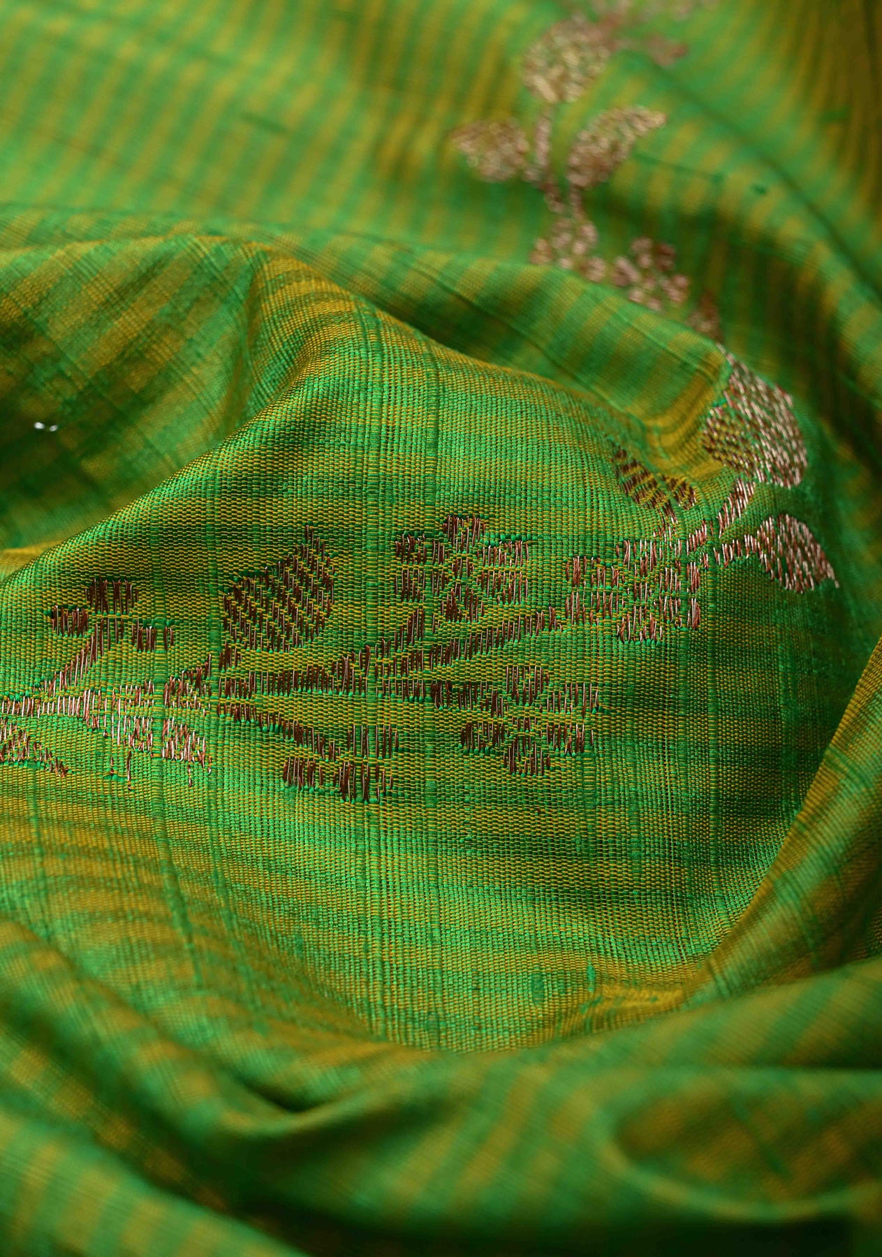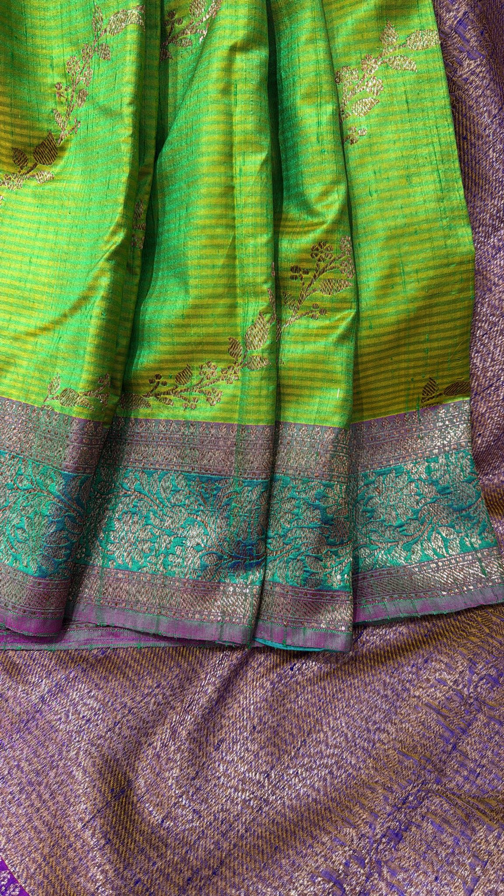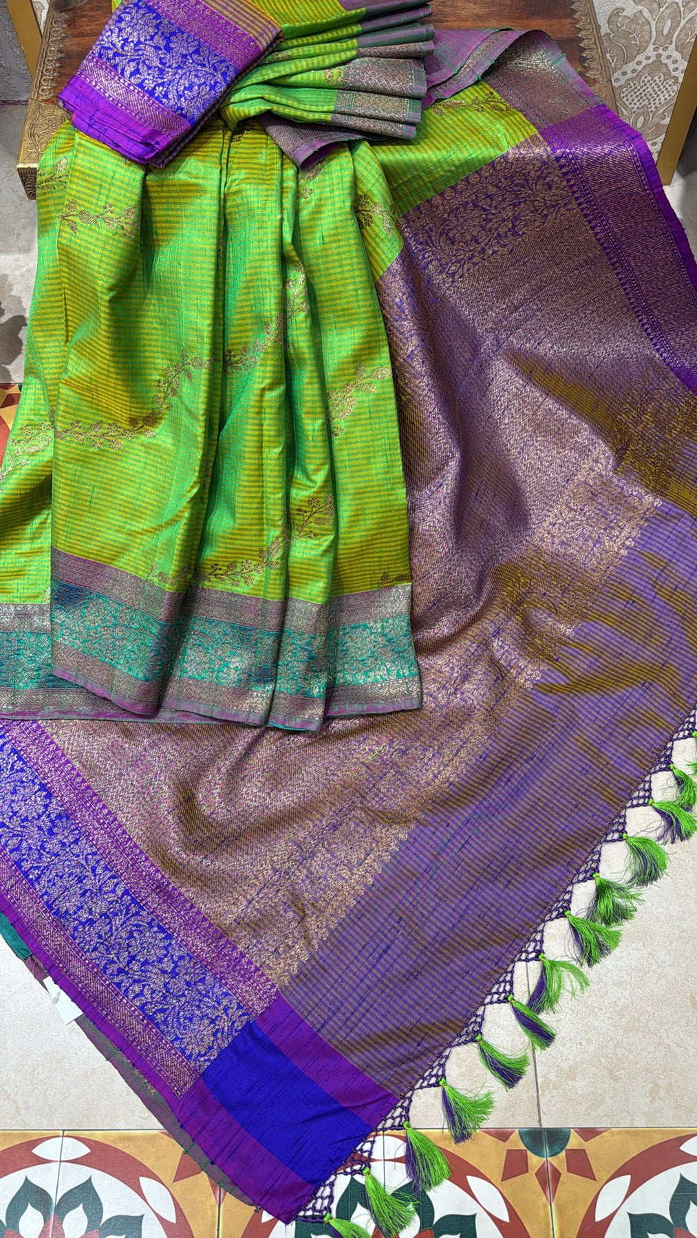 Experience the vibrant elegance of this Green-Yellow Dual Tone Dupion Banarasi Pure Silk Saree, a masterful blend of rich tradition and striking color play. Woven from dupion silk, the saree features the intricate Jungla Leheria Jaal pattern—an exquisite wave motif symbolizing fluidity and grace—woven meticulously throughout the fabric. The dual-tone effect enhances the saree’s depth and allure, shifting beautifully between green and yellow hues as it moves. Complemented by shimmering zari borders, this saree is perfect for festive occasions, weddings, and grand celebrations, embodying regal sophistication and timeless artistry.
