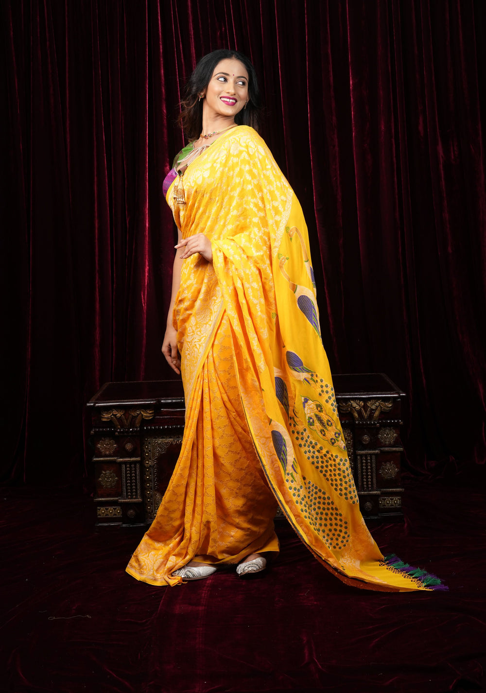 Yellow Banarasi Silk Georgette Saree with Jaal Zari and Resplendent Peacock Meenakari Pallu | SILK MARK CERTIFIED