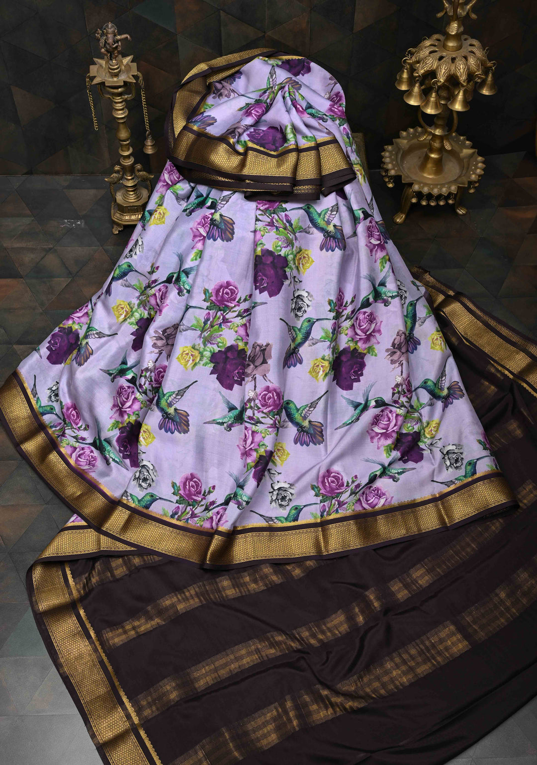 Lilac Pure Mysore Crepe Silk Sarees with Floral Digital Print and Fancy Borders | SILK MARK CERTIFIED