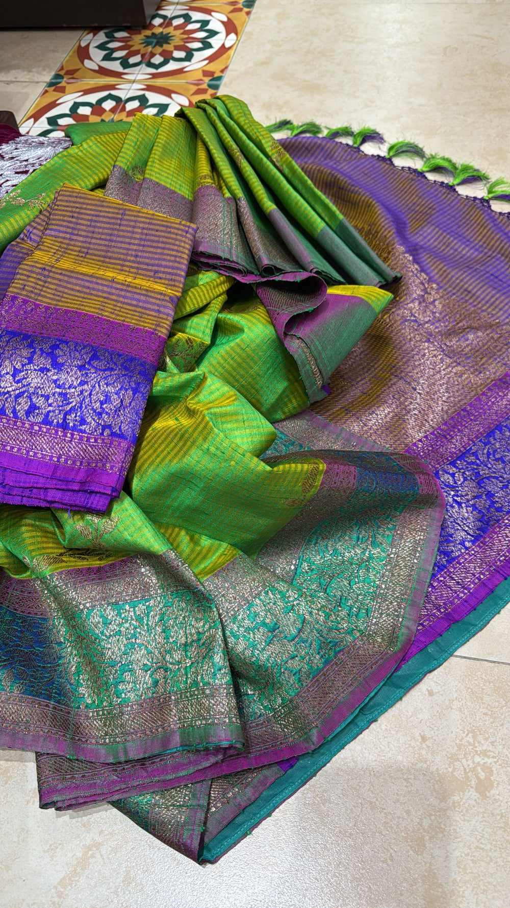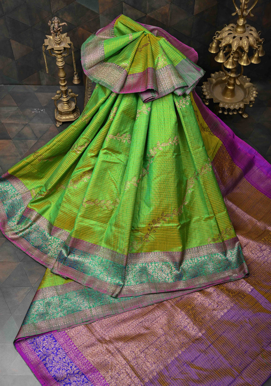 Green -Yellow Dual Tone Dupion Banarasi Pure Silk Saree with Jungla Leheria Jaal Pattern and Antique Zari Borders | SILK MARK CERTIFIED