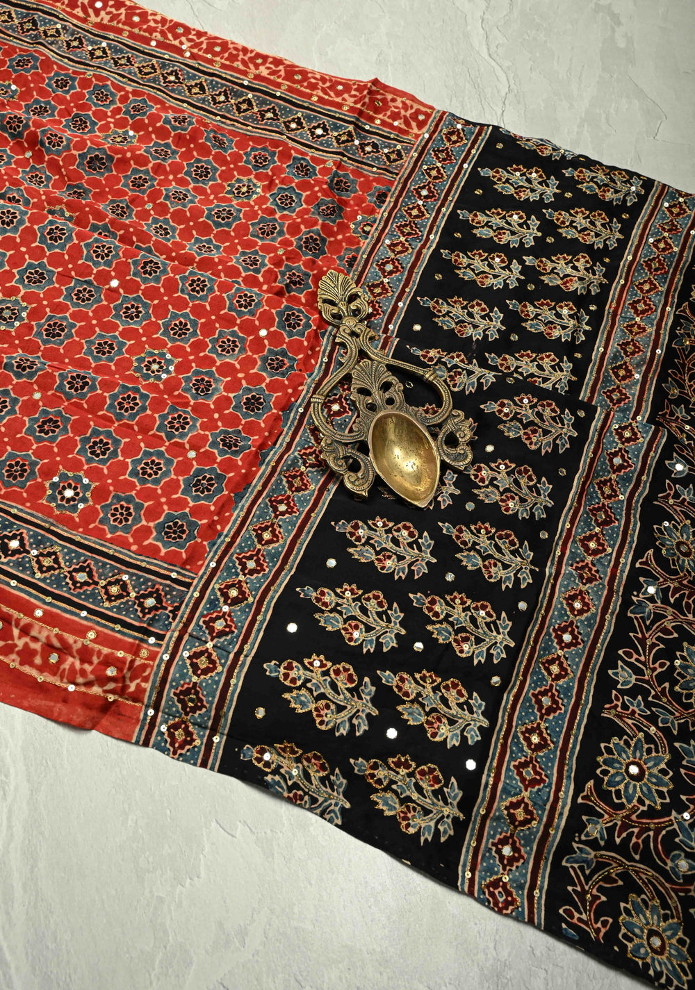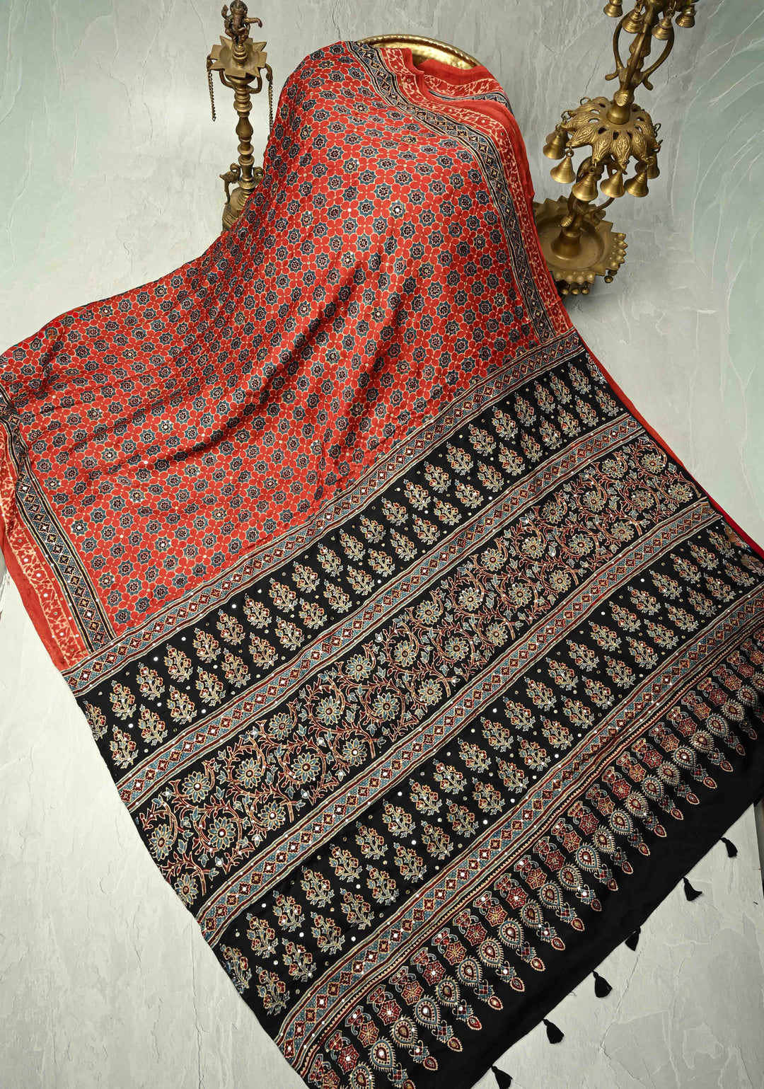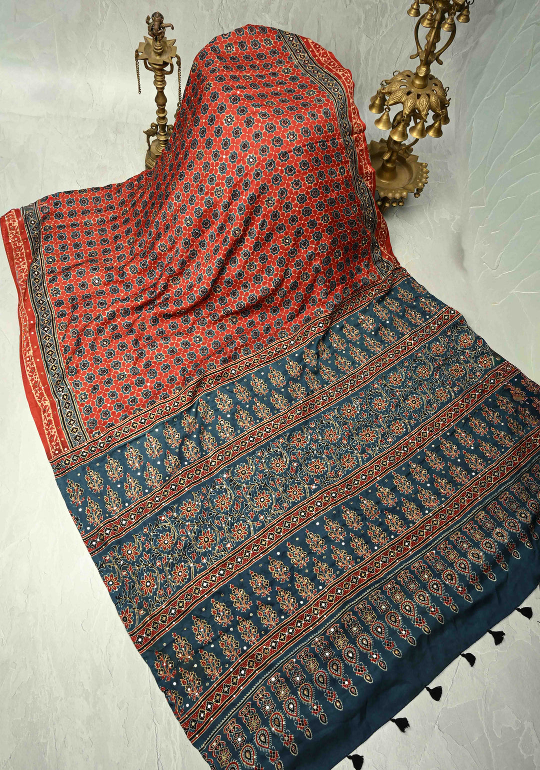 Red Ajrakh Block Print on Modal Saree with Mirror and Ari Work