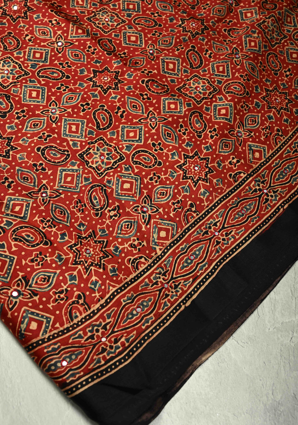 Red Ajrakh Block Print on Modal Saree with Mirror Work