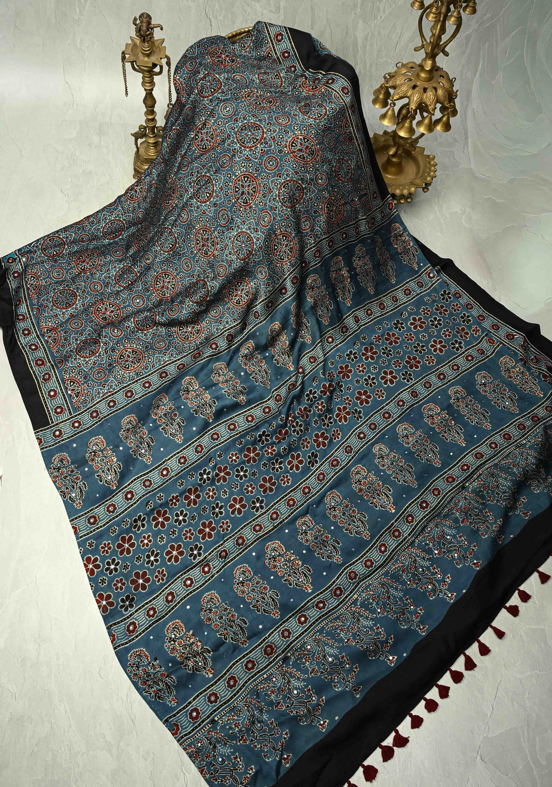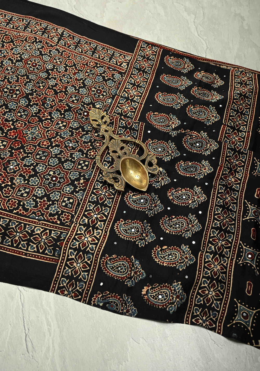 Stunning Black Ajrakh Block Print on Modal Saree with Mirror Work