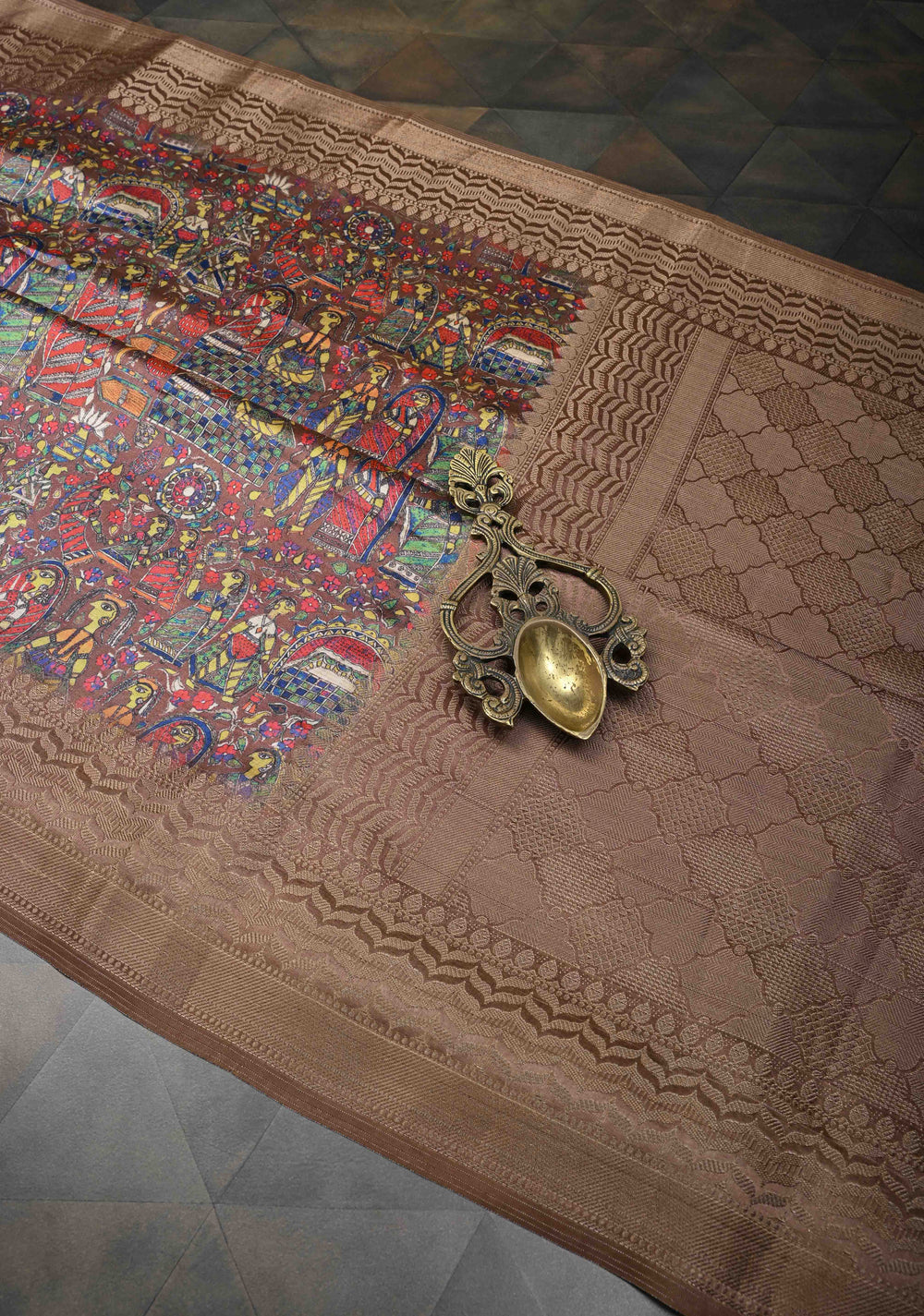 Brown Art Silk Saree with Kalamkari Digital Print and Antique Zari Border