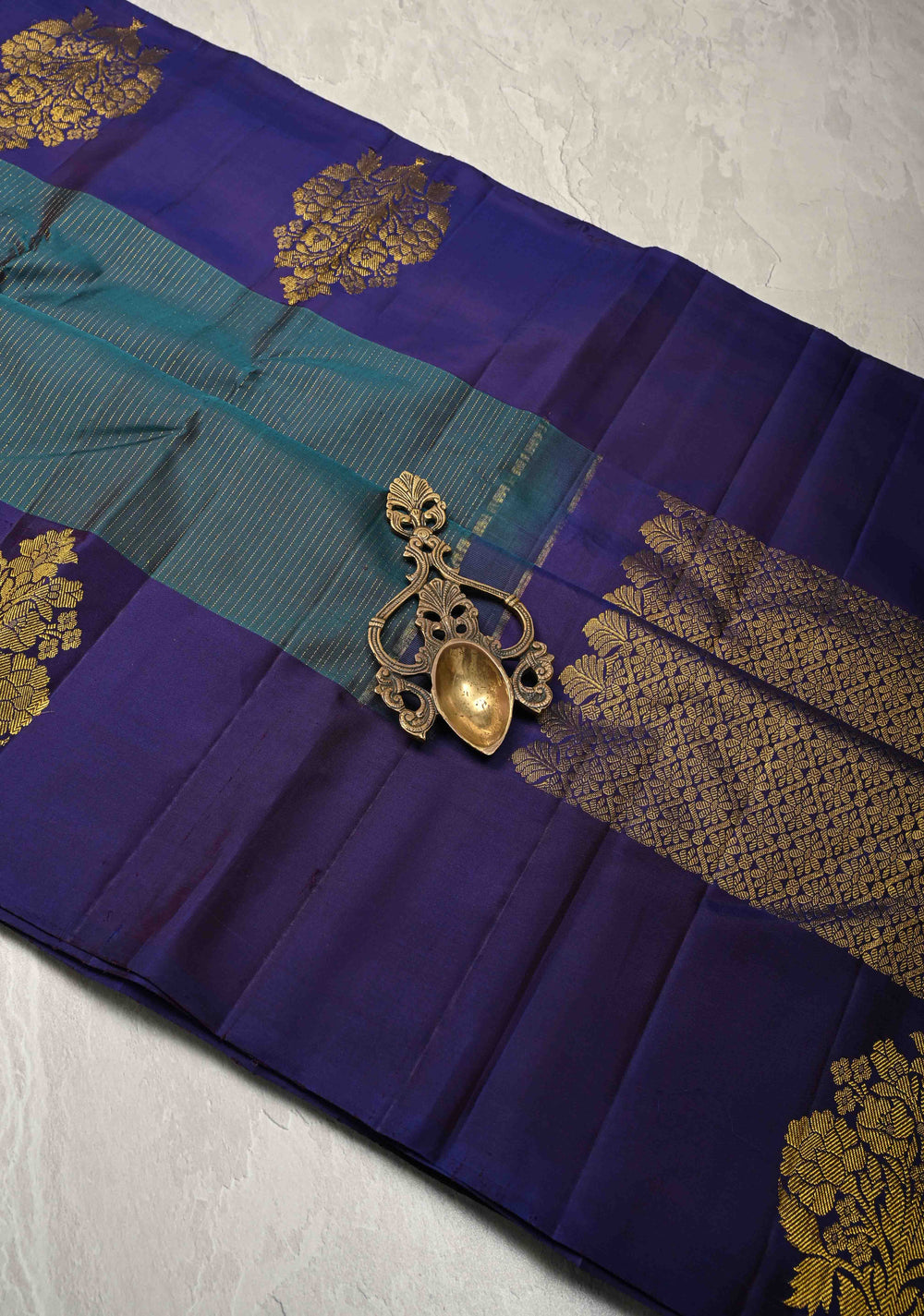 Peacock Blue Dual Tone Vairaoosi Zari Stripes on Pure Kanjivaram Silk Handloom Saree with Damask Buttas and Zari Border | SILK MARK CERTIFIED