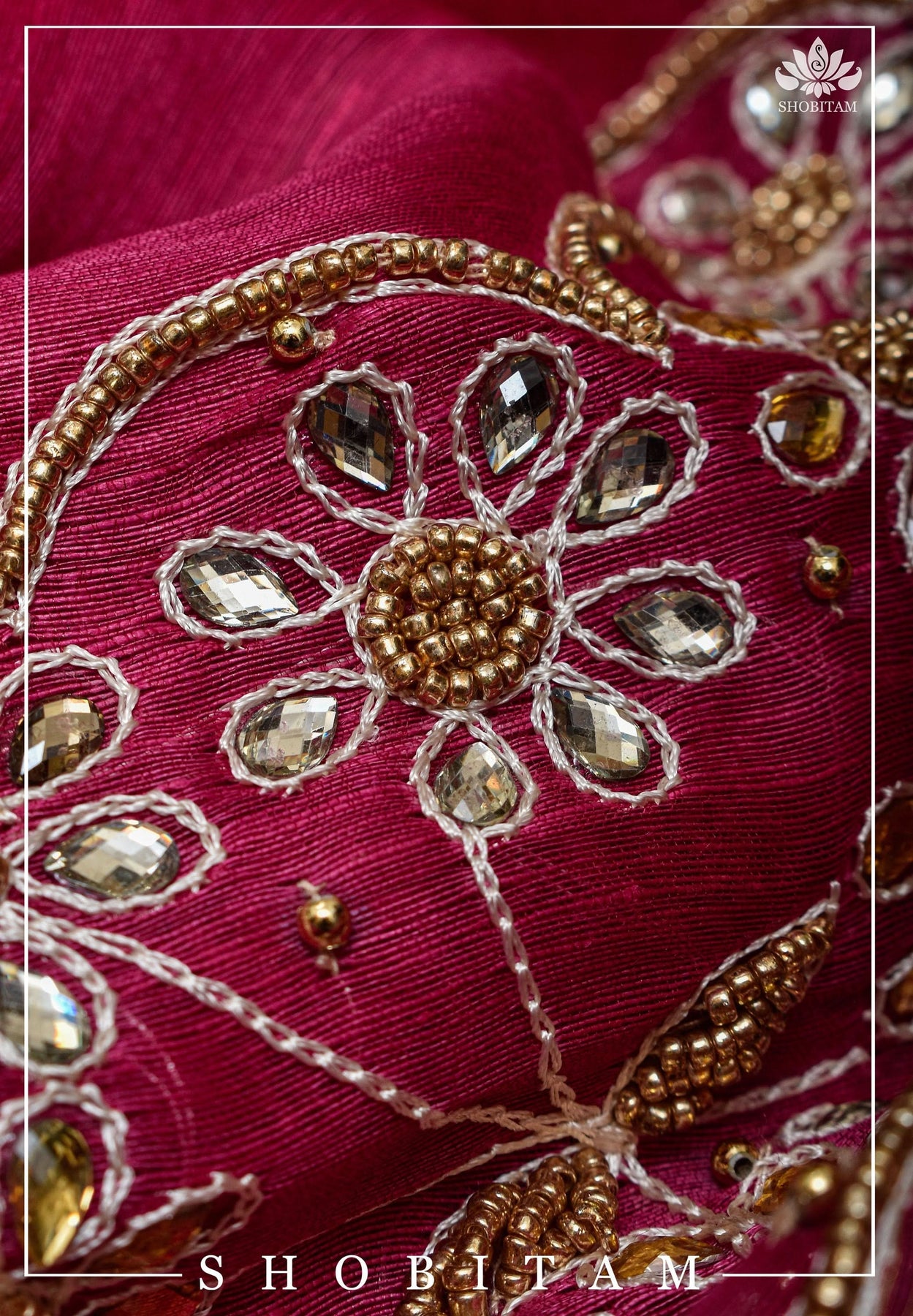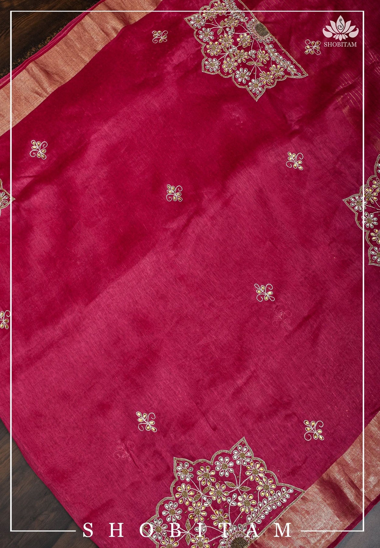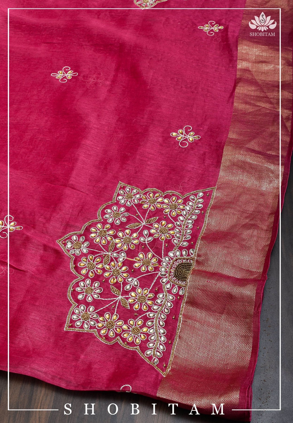 Presenting an elegant silk Linen saree in pretty pink with gold Zari border. The Saree has beautiful kundan stone and resham embroidery and comes with a matching blouse piece.Pretty tassels and zari adorn the pallu.