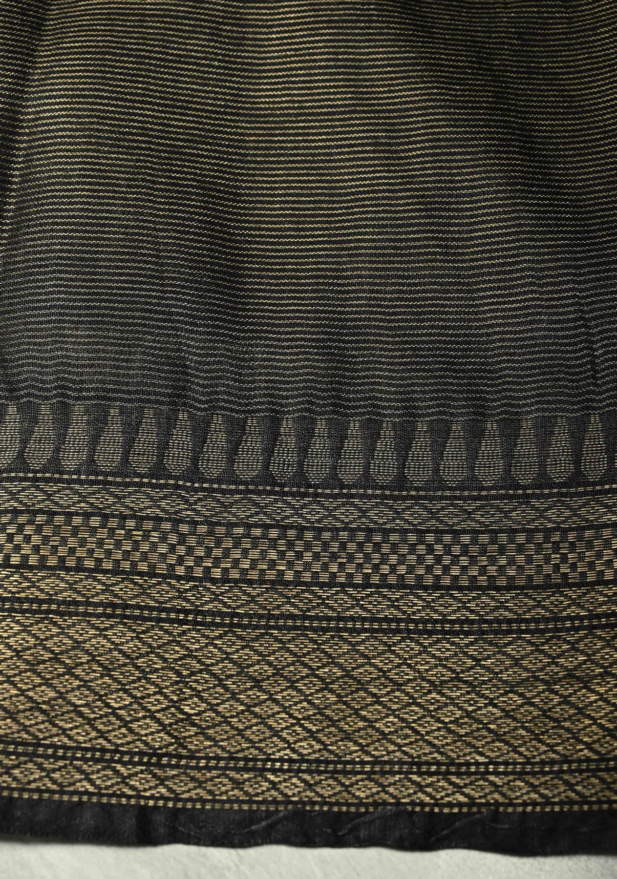 The saree is accented with a zari border, adding a touch of shimmer and traditional charm to the deep black fabric. Its classic design makes it versatile for both contemporary and traditional styling.