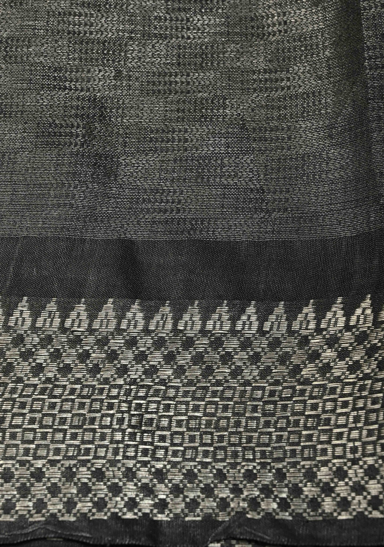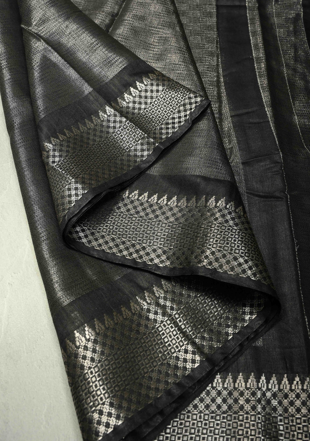 Turn heads with this Black Semi Tussar Tissue Saree, a perfect blend of contemporary sheen and traditional craftsmanship. The black body, woven in lustrous tissue-textured semi tussar, adds a subtle glow and an elegant drape. A striking temple silver zari border frames the saree beautifully, enhancing its classic charm with a touch of heritage artistry. Lightweight, graceful, and effortlessly stylish, this saree is ideal for gatherings, and special celebrations. A stunning choice for those who love modern elegance with traditional detailing.