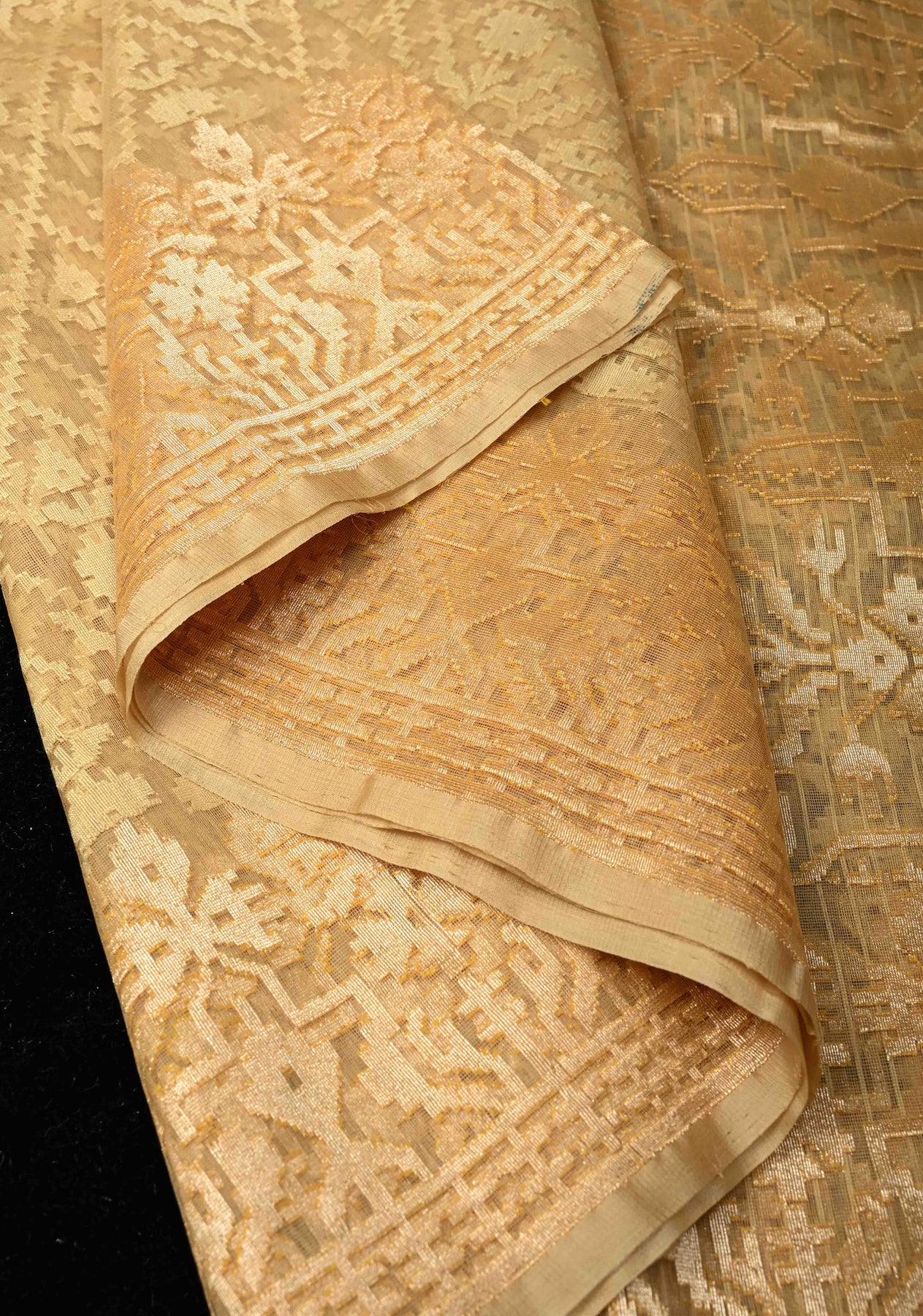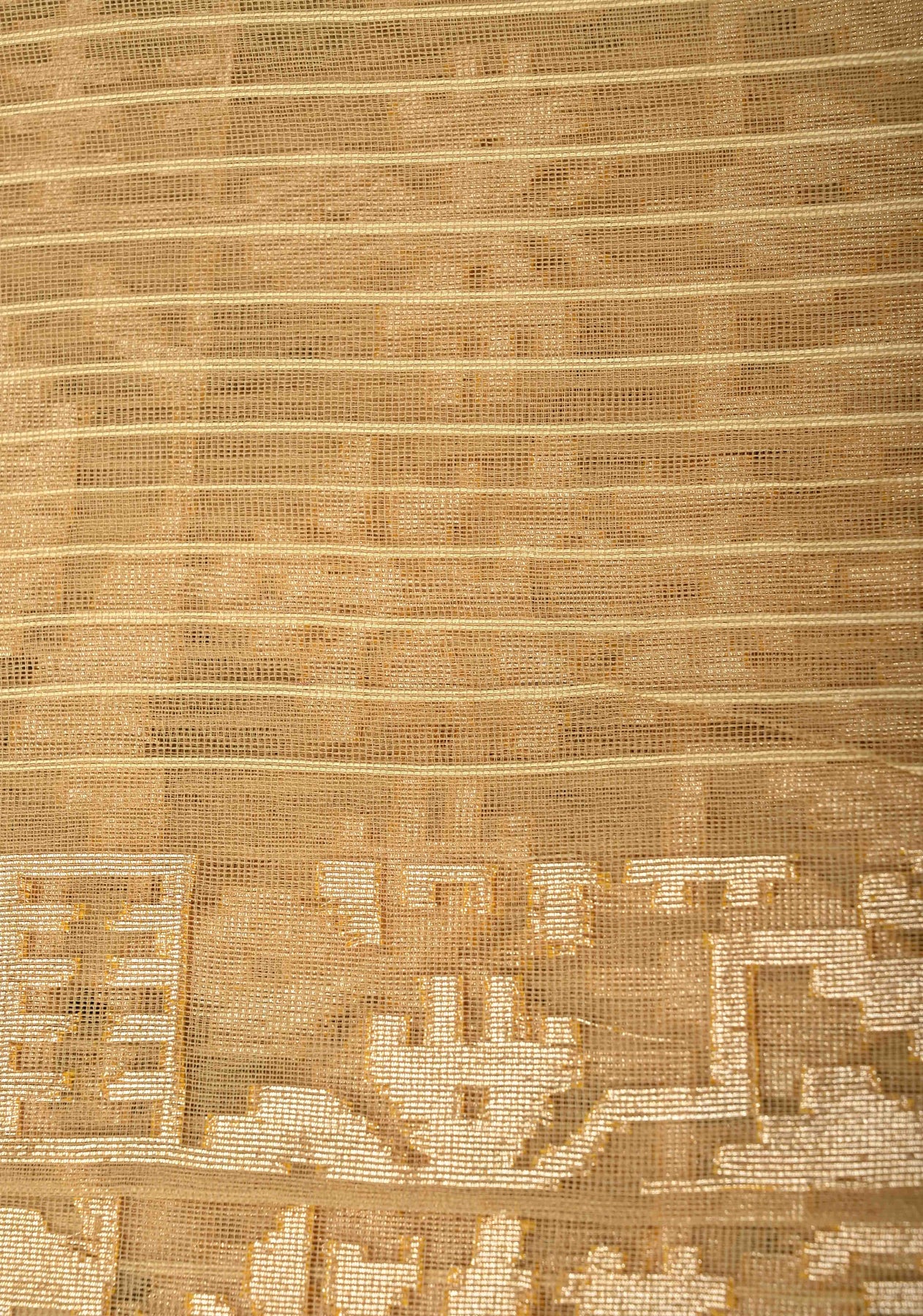 Experience timeless elegance with this Golden Hue Banarasi Net Handloom Saree, featuring exquisite Jamdhani-style handwoven detailing. The delicate net fabric beautifully showcases intricate patterns, blending traditional craftsmanship with a modern aesthetic. Its rich golden shade adds a regal touch, perfect for weddings, festivals, and special occasions. Lightweight and gracefully draped, this saree promises both comfort and sophistication, making it a stunning addition to your ethnic collection.