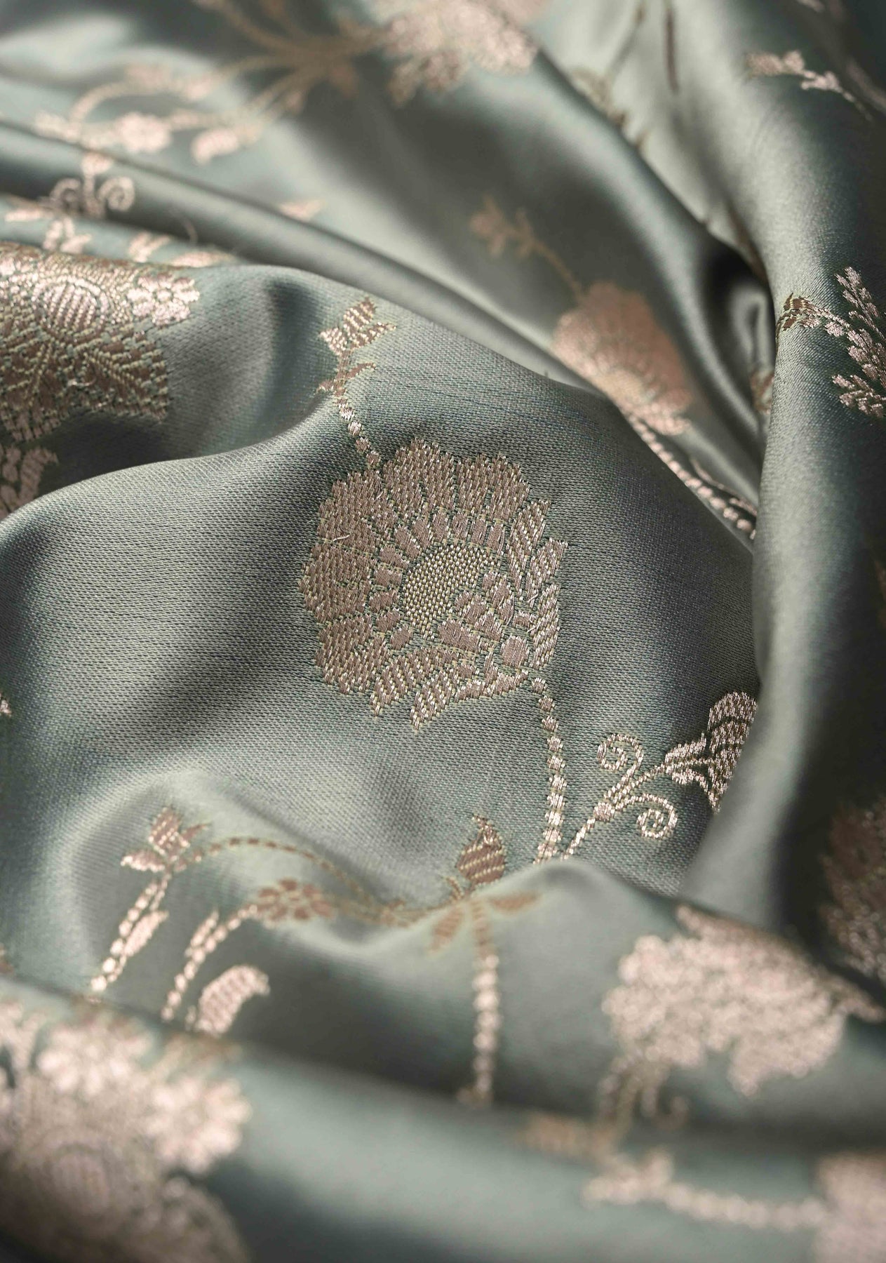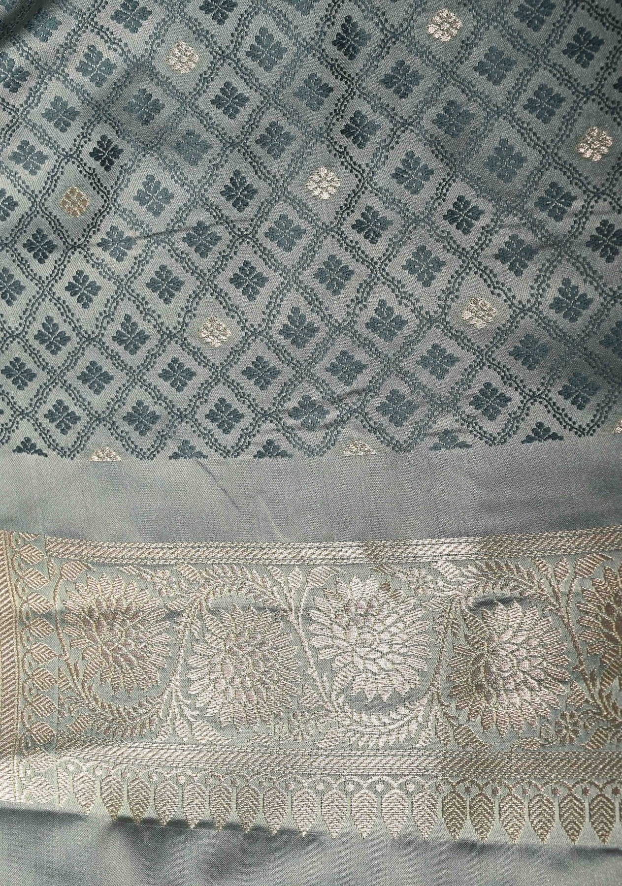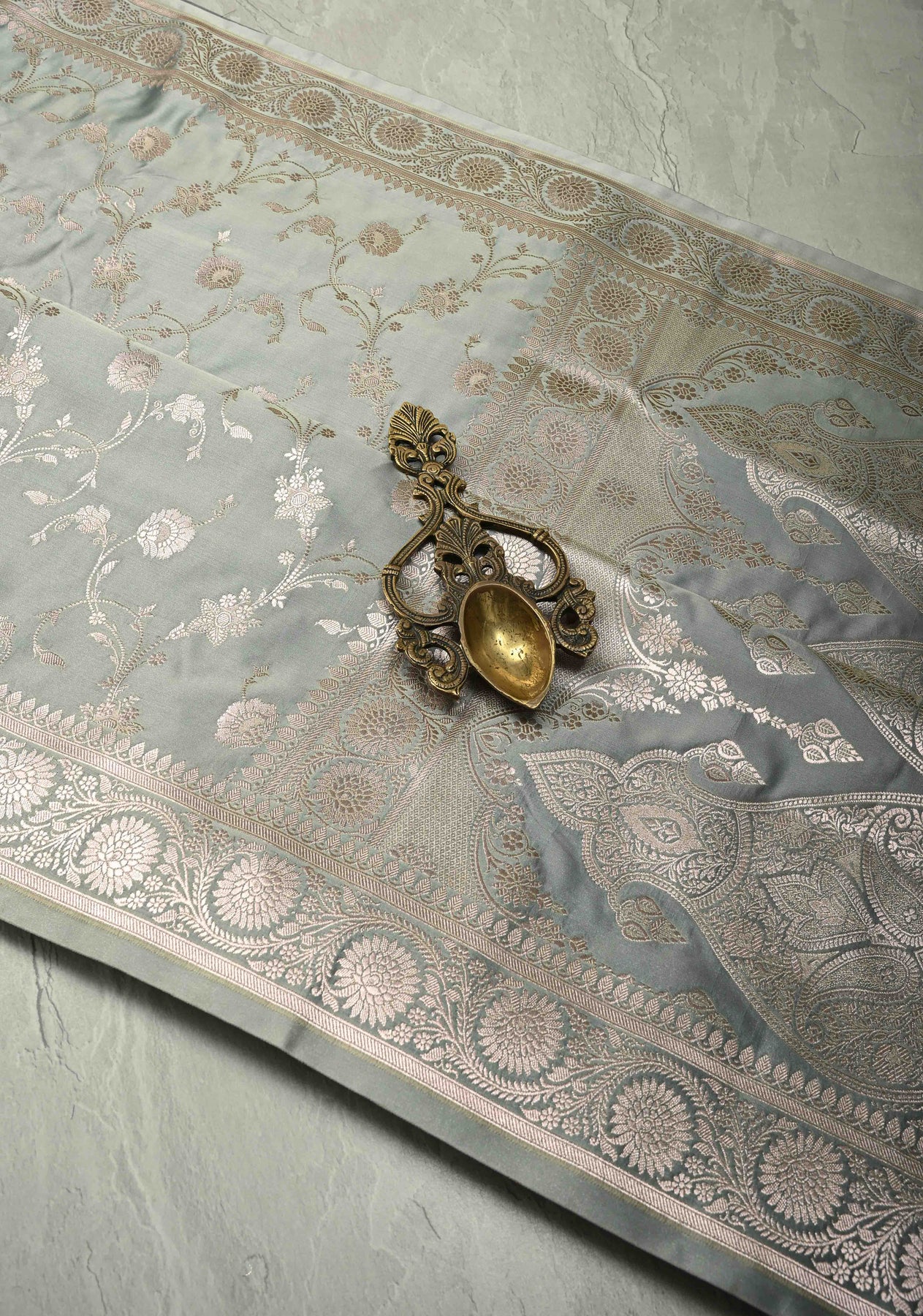 Elevate your festive and occasion wear with this elegant Gray Banarasi Semi Mashru Silk Saree, crafted to offer a smooth, lustrous drape that Mashru silk is admired for. The saree features a beautifully woven silver floral jaal, adding a sophisticated shimmer against the refined gray base.