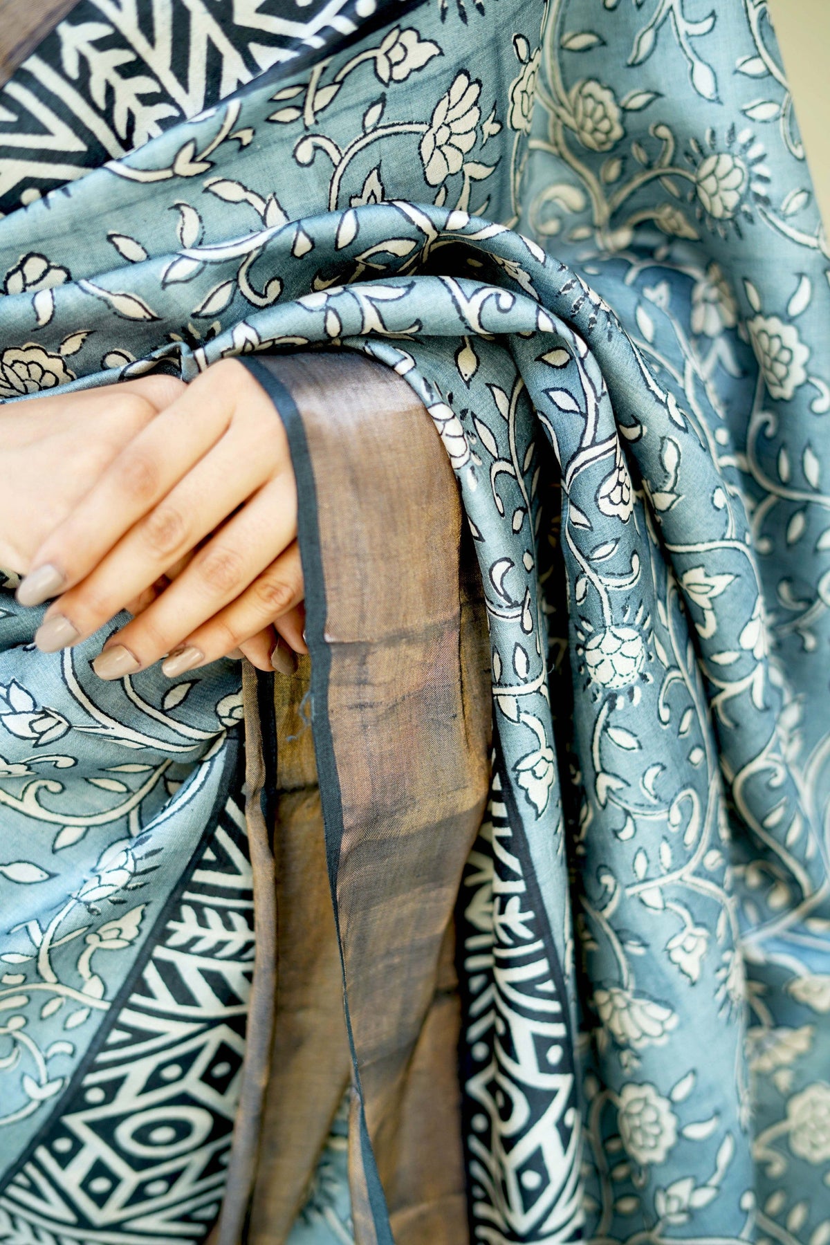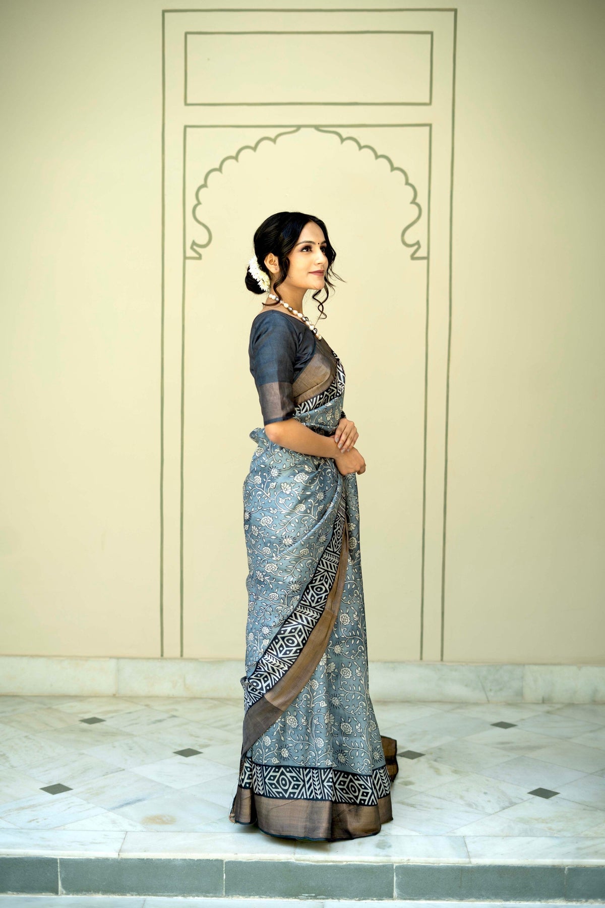 The Gray Jari Tussar Silk Saree with Floral Handblock Print is a sophisticated and elegant choice that seamlessly blends tradition with contemporary style. Woven from soft tussar silk in a subtle gray shade, this saree is adorned with intricate floral handblock prints that add a timeless charm and delicate texture to the fabric. The exquisite zari border enhances the overall look with a touch of shimmer and grace, making it perfect for formal events, festive occasions, or cultural gatherings. Lightweight yet luxurious, this saree is a versatile addition to any ethnic wardrobe.
