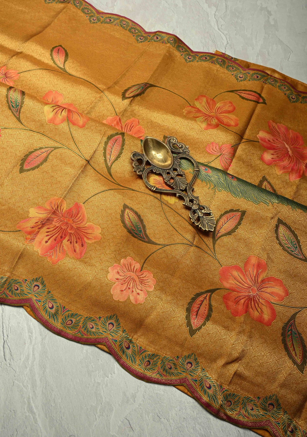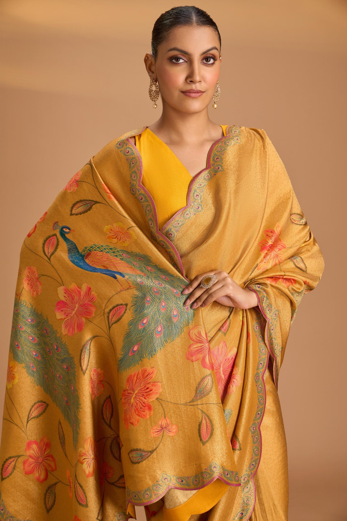 A celebration of nature’s grandeur, featuring intricately crafted, fully bloomed flowers intertwined with the majestic peacock in all its resplendent hues. Rich in detail and texture, the design captures the elegance and vibrancy of traditional artistry with a contemporary, ethical twist.