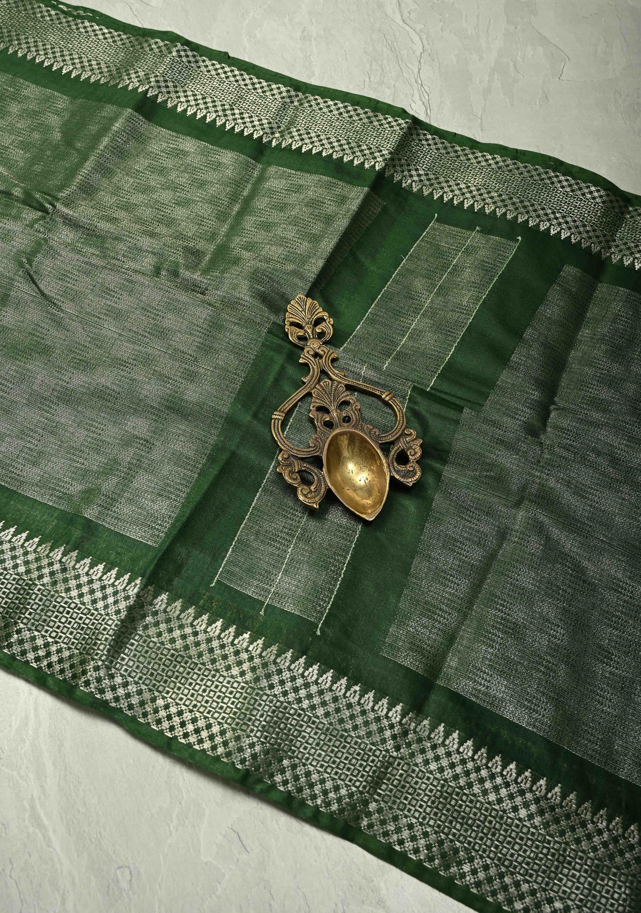 Exude elegance and tradition with this Myrtle Semi Tussar Saree, crafted from soft, lightweight fabric for a graceful and comfortable drape. The soothing myrtle green body is accentuated with a beautifully woven temple silver zari border, adding a touch of heritage charm and refined sophistication. Perfect for weddings, festive occasions, and cultural celebrations, this saree blends classic craftsmanship with contemporary style, making it an ideal choice for a timeless, elegant look.