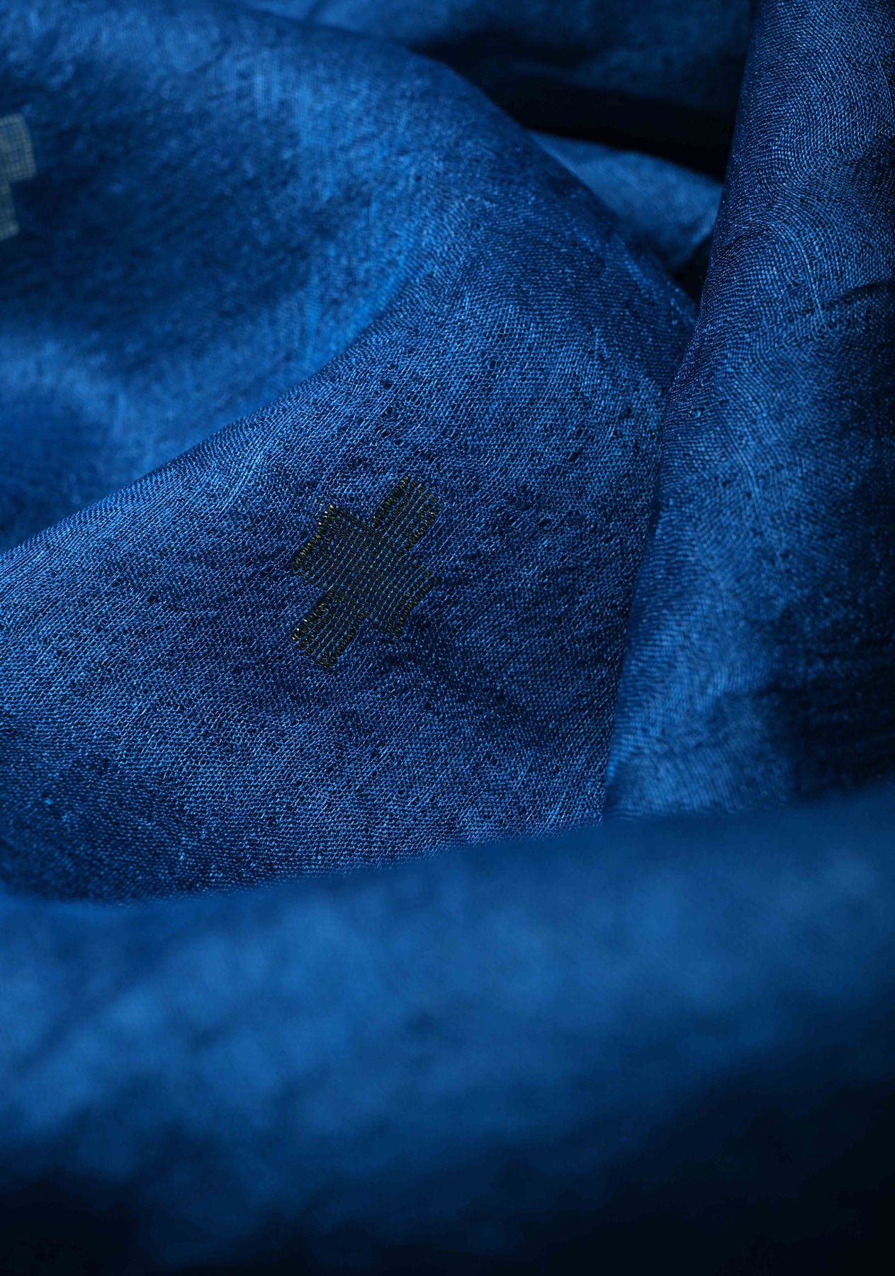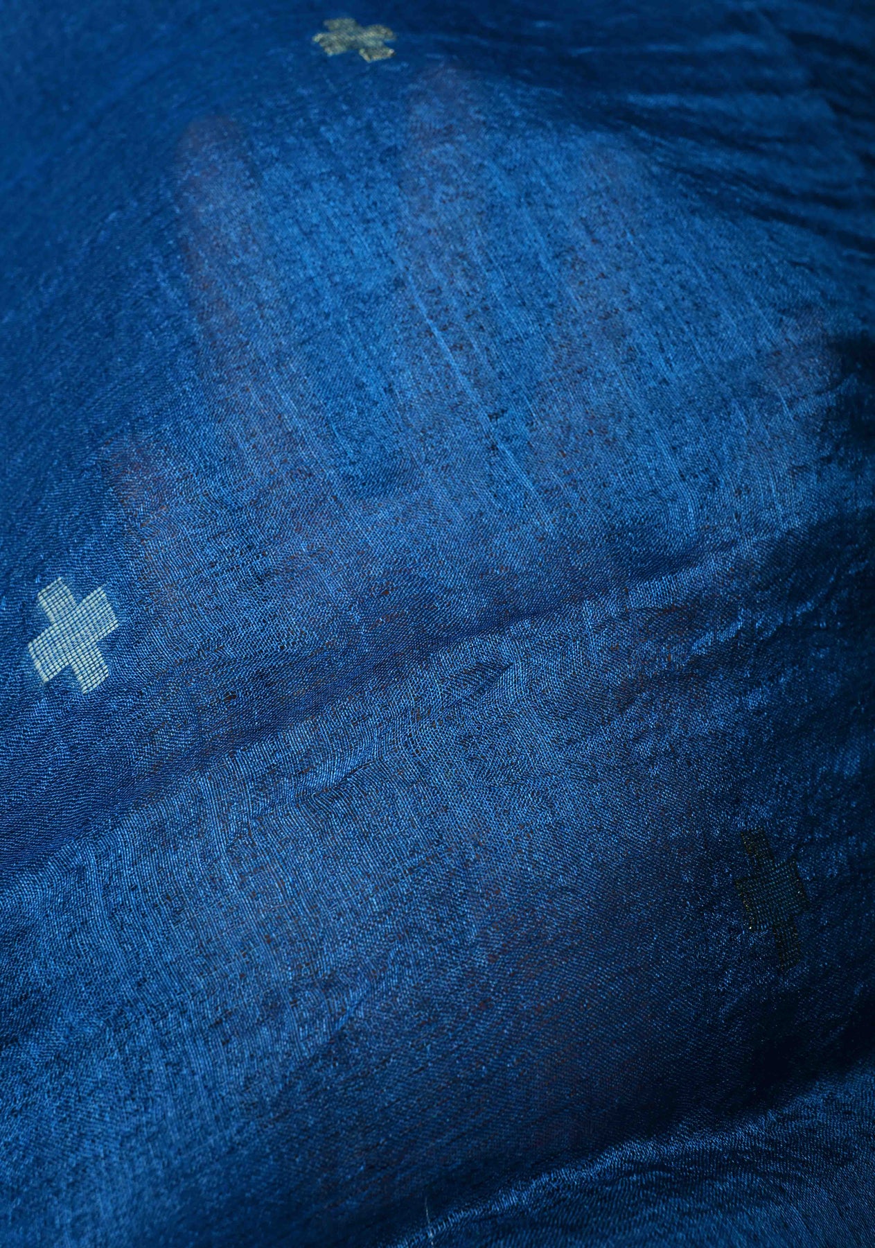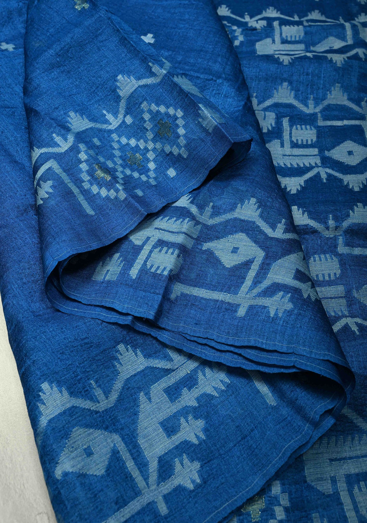 Embrace timeless elegance with this Peacock Blue Tussar Silk Saree, adorned with intricate Meenakari Resham buttas that reflect exquisite Indian craftsmanship. Handwoven from premium Tussar silk, it features a soft, textured drape with a subtle natural sheen.