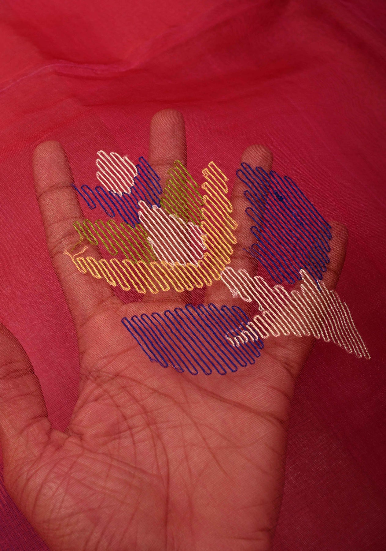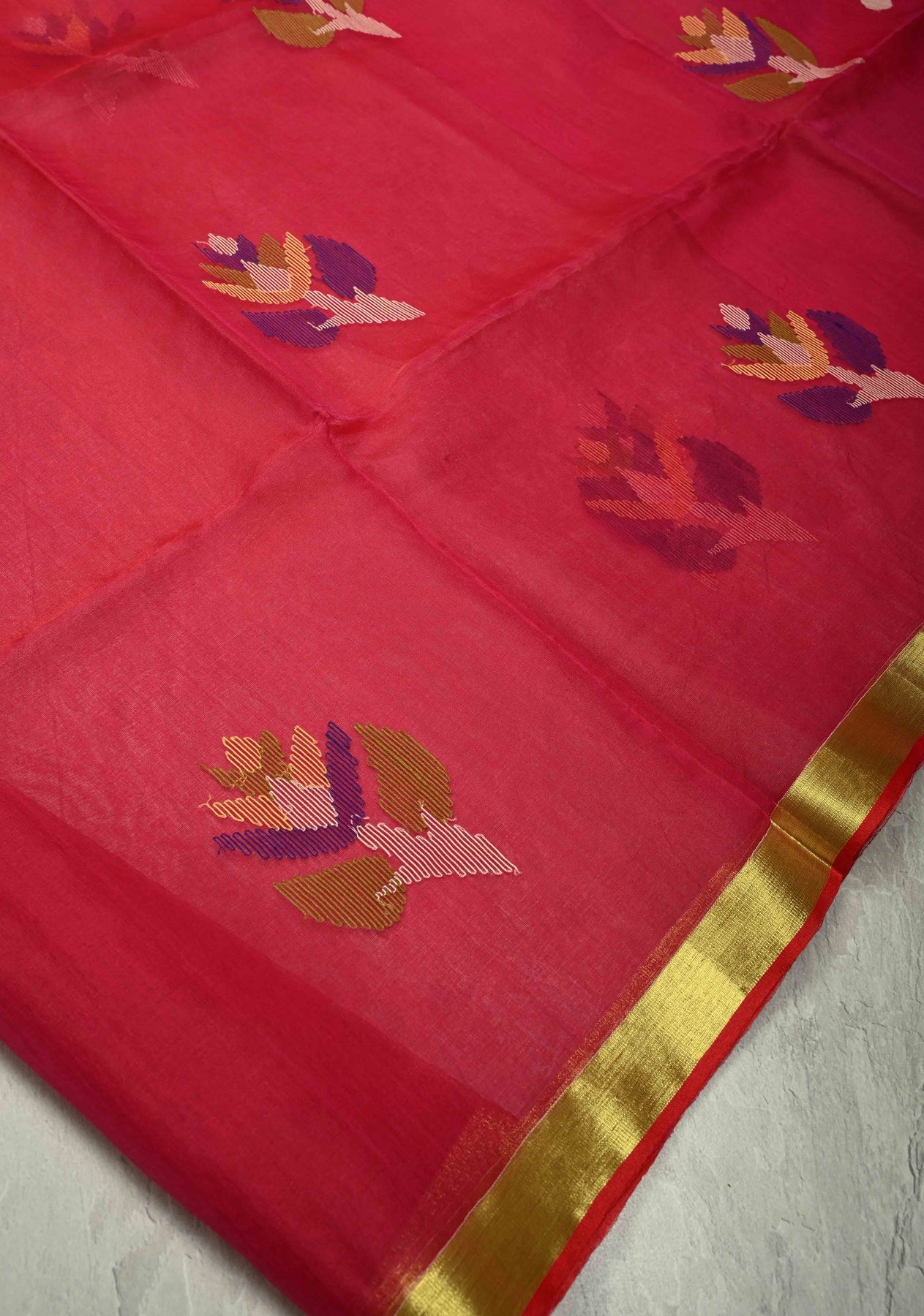 Drape yourself in elegance with this Pink Dual Tone Silk Muslin Saree, featuring intricate Meenakari designs and delicate Resham Jamdani weaving. Handcrafted by skilled artisans, the saree beautifully blends traditional artistry with contemporary charm.