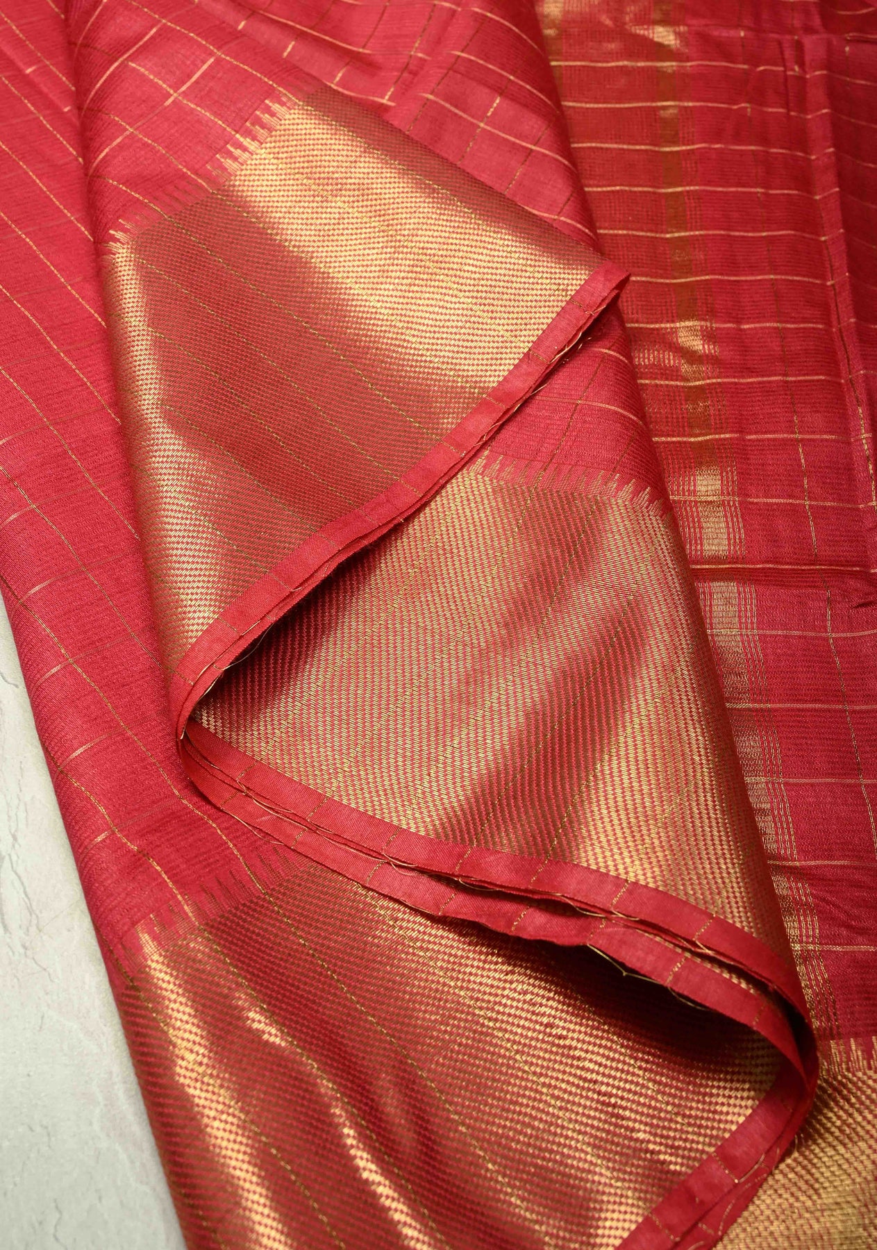 Pinkish Red Semi Tussar Saree with Zari Checks and Temple Zari Border