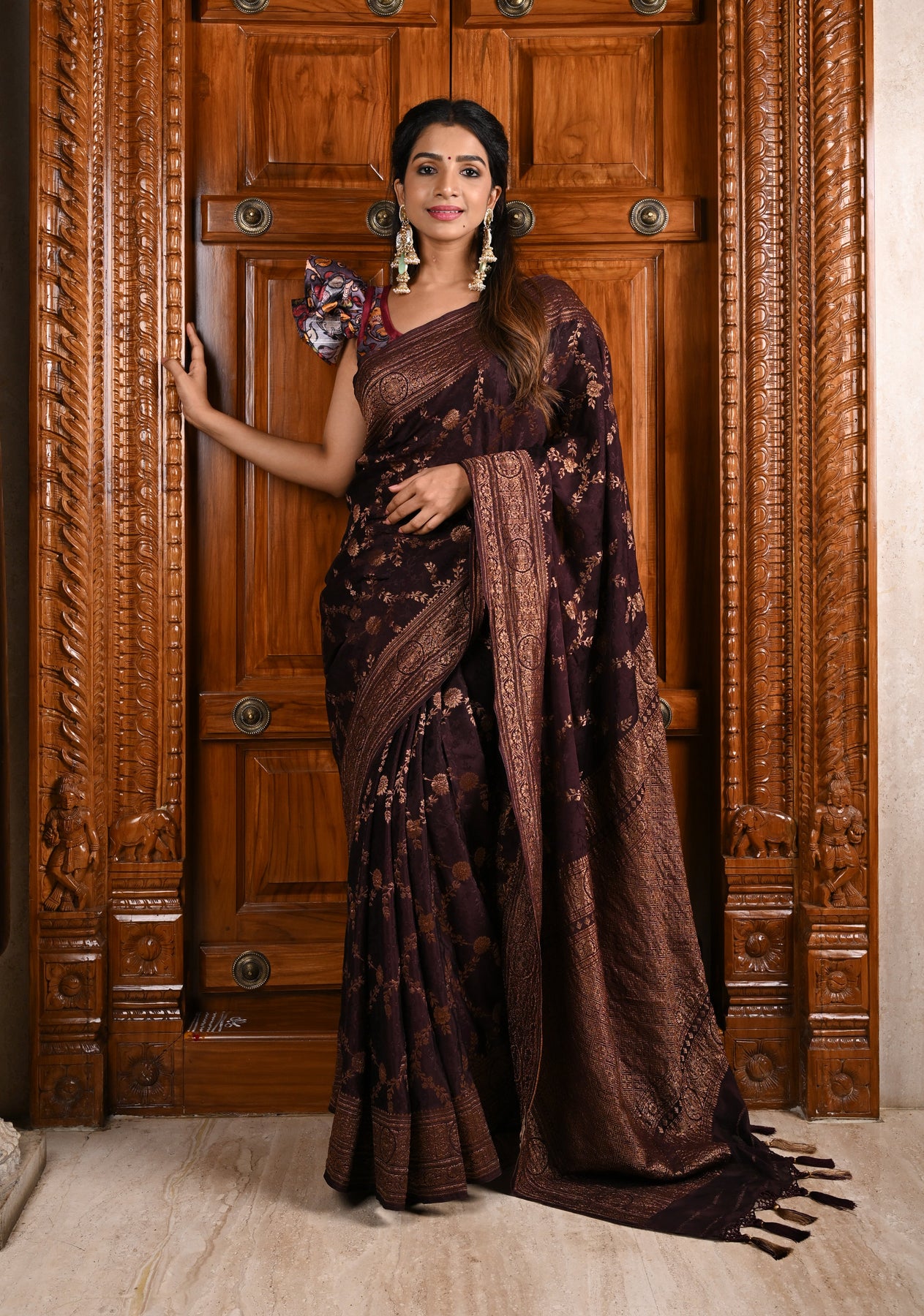 The Coco Brown Mysore Silk Saree is a beautiful fusion of elegance and intricate craftsmanship. Made from Mysore silk, this saree features coco brown hue that adds a warm, refined touch to any occasion. Adorned with antique zari floral jaal, the saree showcases a delicate yet opulent design, creating a timeless appeal. The intricately woven zari border further enhances its regal charm, making it an ideal choice for weddings, festivals, and special celebrations. With its rich fabric and exquisite detailing, this Mysore silk saree is the perfect combination of tradition and luxury.