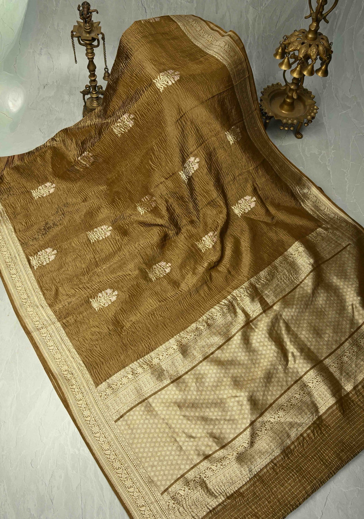 Step into effortless elegance with this Brownish Gold Banarasi Crushed Tissue Saree. Crafted from crushed tissue fabric, it features a lustrous shimmer and a fluid, lightweight drape that exudes sophistication. The saree is adorned with intricate Meenakari floral thread buttas, adding colorful artistry and delicate detailing to its rich golden-brown base. The look is beautifully completed with a regal zari border, offering a traditional touch that enhances its festive appeal. Ideal for weddings, receptions, and grand celebrations, this saree blends glamour with timeless Banarasi craftsmanship.
