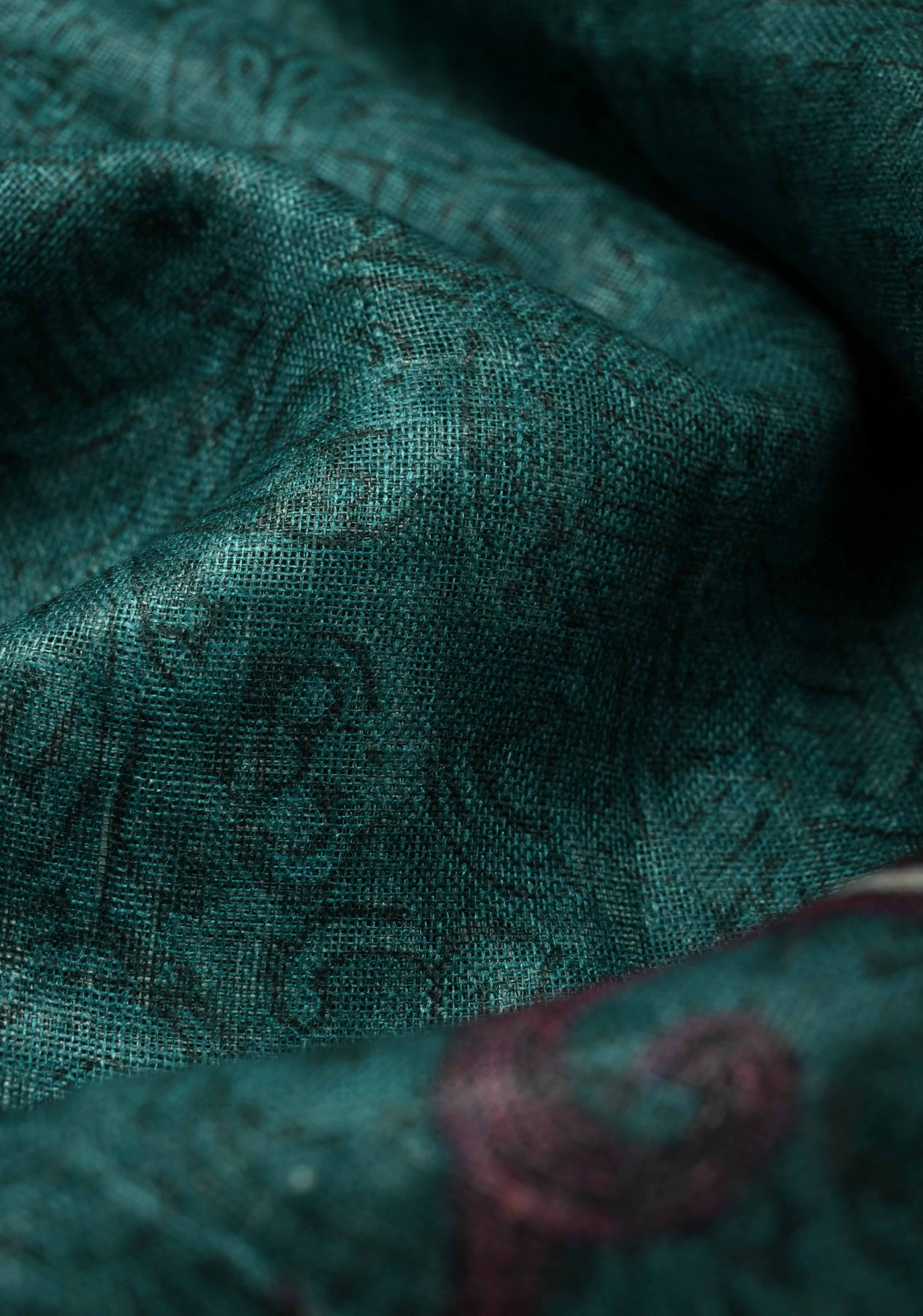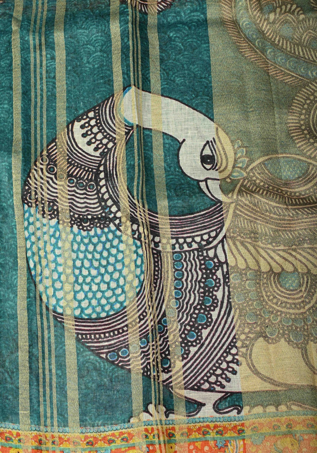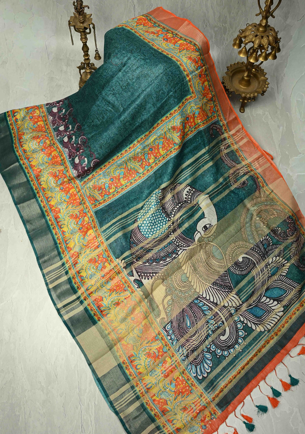 This captivating teal linen saree showcases a beautiful Kalamkari digital print, featuring intricate motifs and vibrant colors. The saree’s pallu is adorned with elegant peacock motifs, adding a regal and artistic touch to the design. The Ganga Jamuna tissue border, with its shimmering golden and silver hues, adds a sophisticated contrast, elevating the saree’s charm. Lightweight and breathable, this saree blends traditional art with modern aesthetics, making it perfect for festive occasions, cultural celebrations, or elegant evening events.